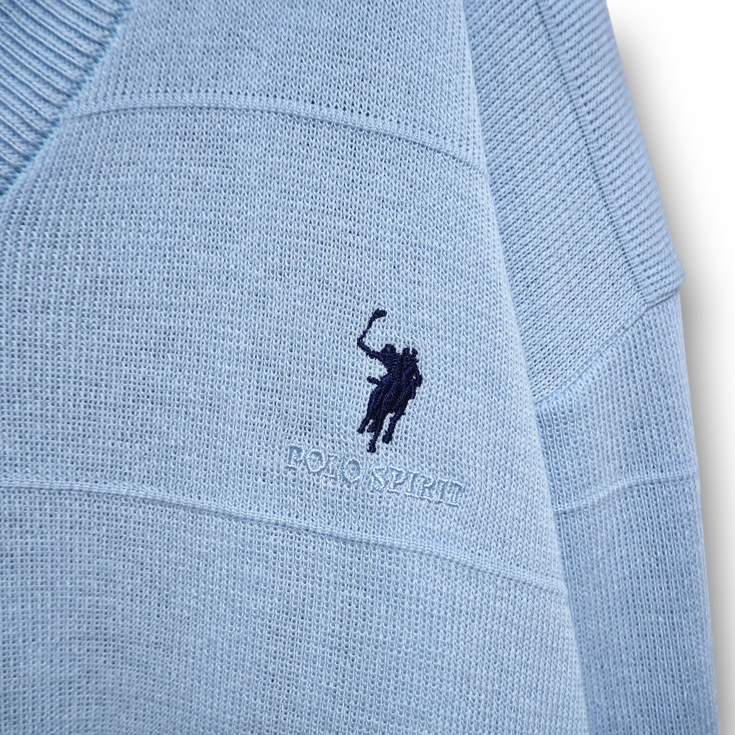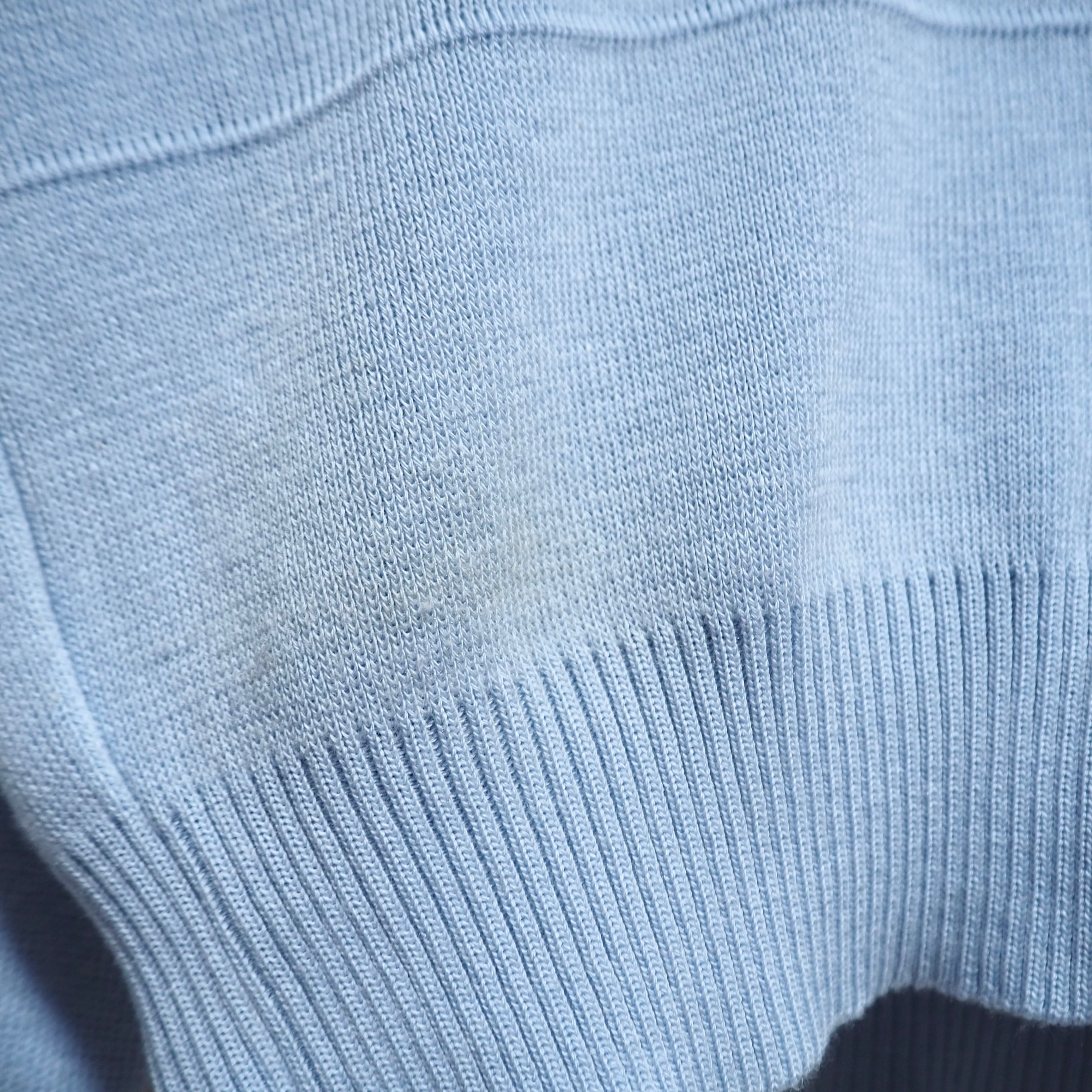 シャツの襟元やポケット下部、ニット下部、襟元や袖口に小さな汚れあり。