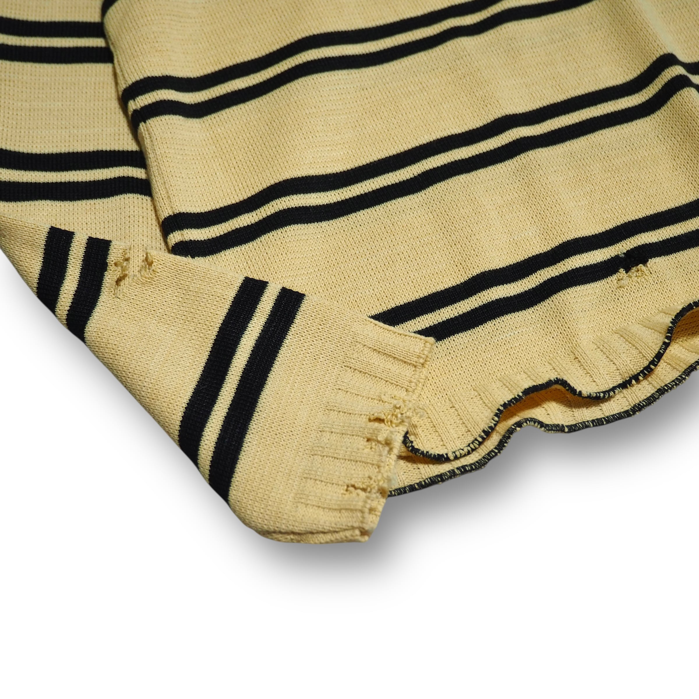 コットン基調のVネックニットにボロ加工とメロウ加工を施したリメイクアイテムです。アイコニックなワニ刺繍にいい塩梅のダメージ感が映えた佇まいを構築致しました。メロウは波打ちをかなり抑え、フェミニンらしさを軽減。かなりジャストサイズにはなりますが男性の方でも着用できるサイジングをしていますのでユニセックスでご検討ください。