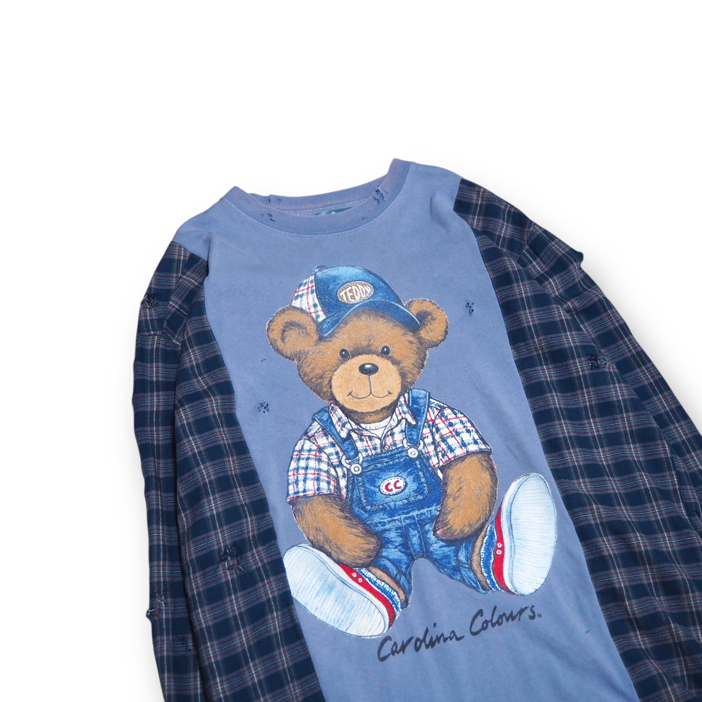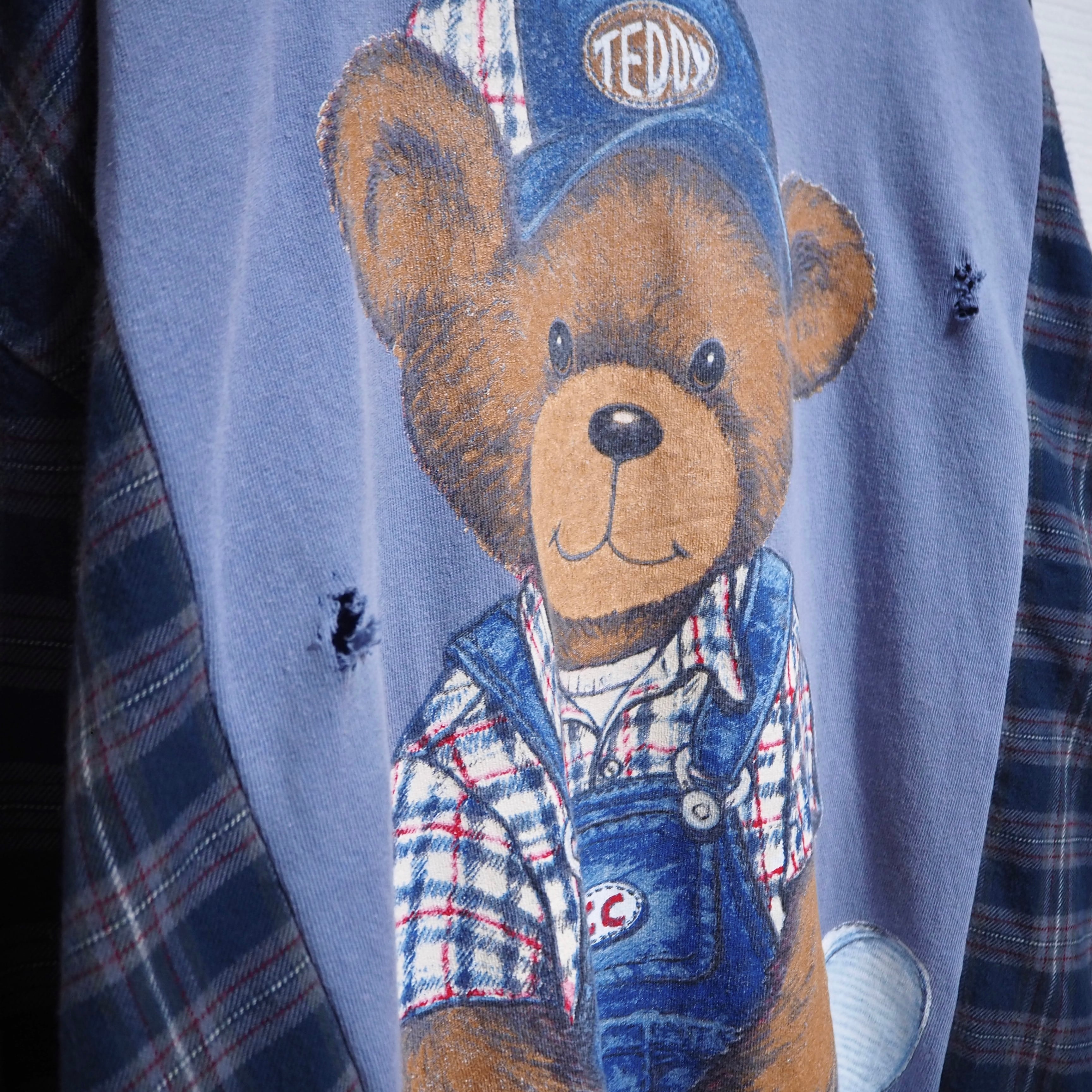 両面に描かれたクマのデザイン、襟元のフェード感に合うよう随所にボロ加工を行いいい塩梅の使用感を演出致しました。可愛らしいシルエットを構築するべくサイズはゆったり目を選定。凡そ同系色なカラーリングをしており、デニムを中心とした多彩なパンツとも相性が良さそうです◎