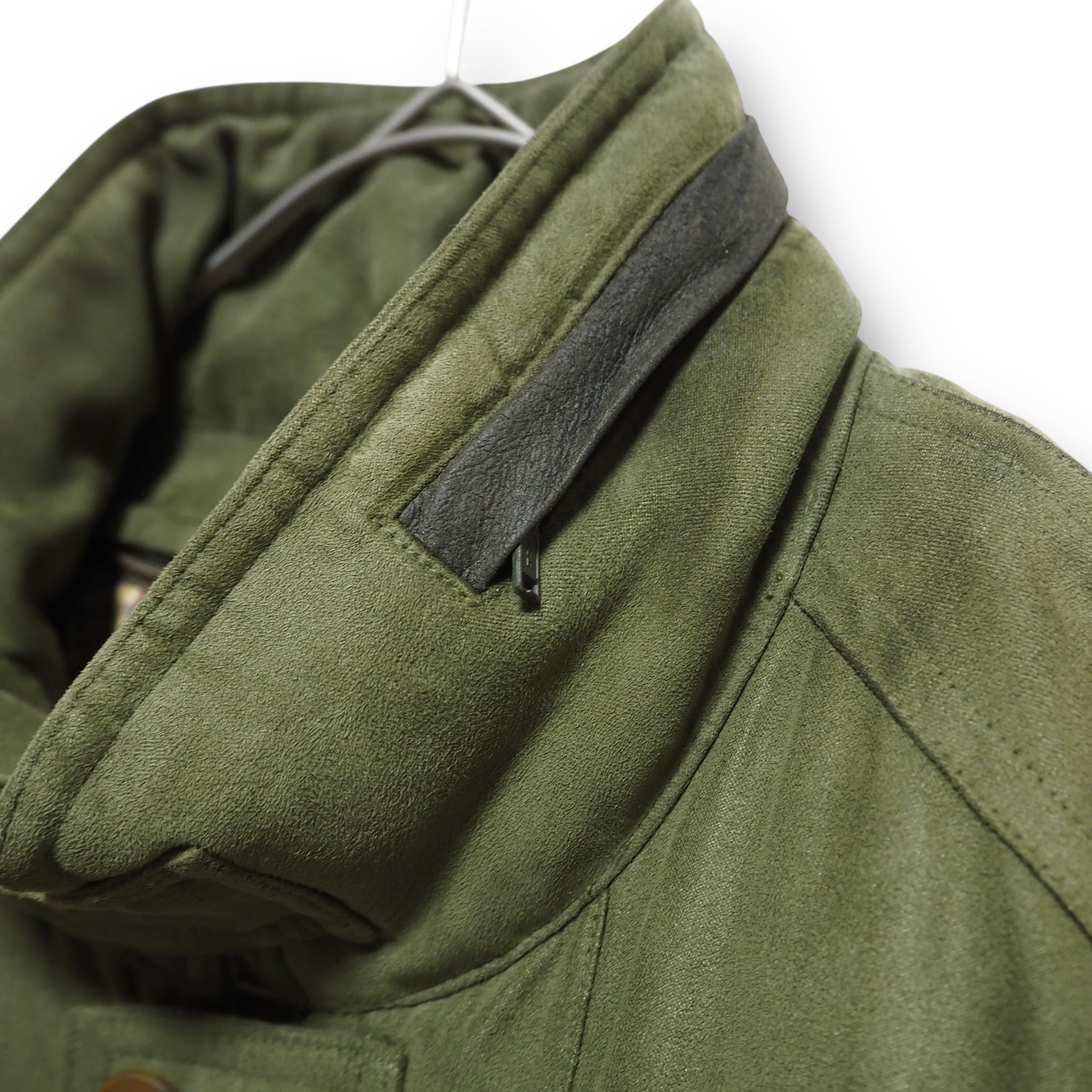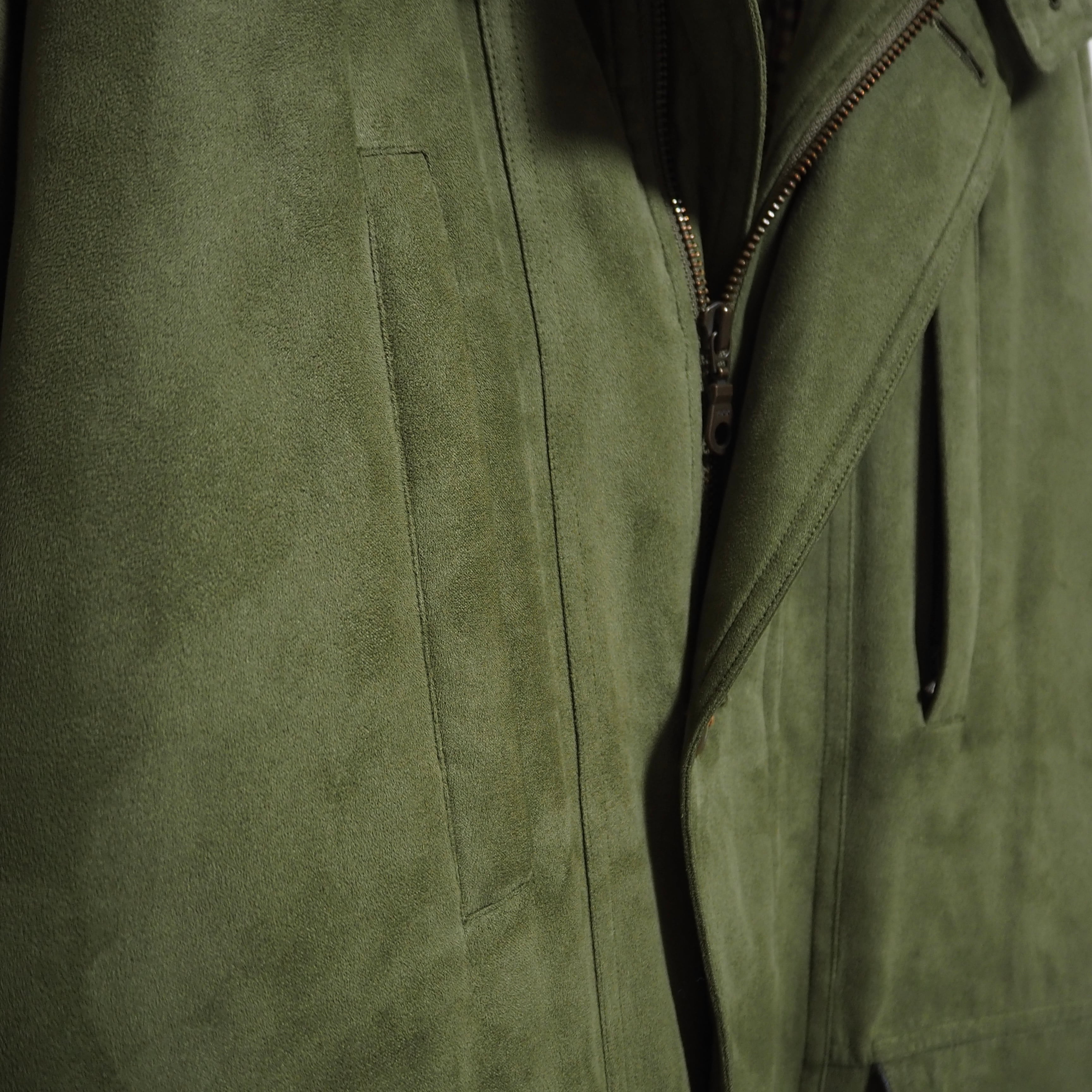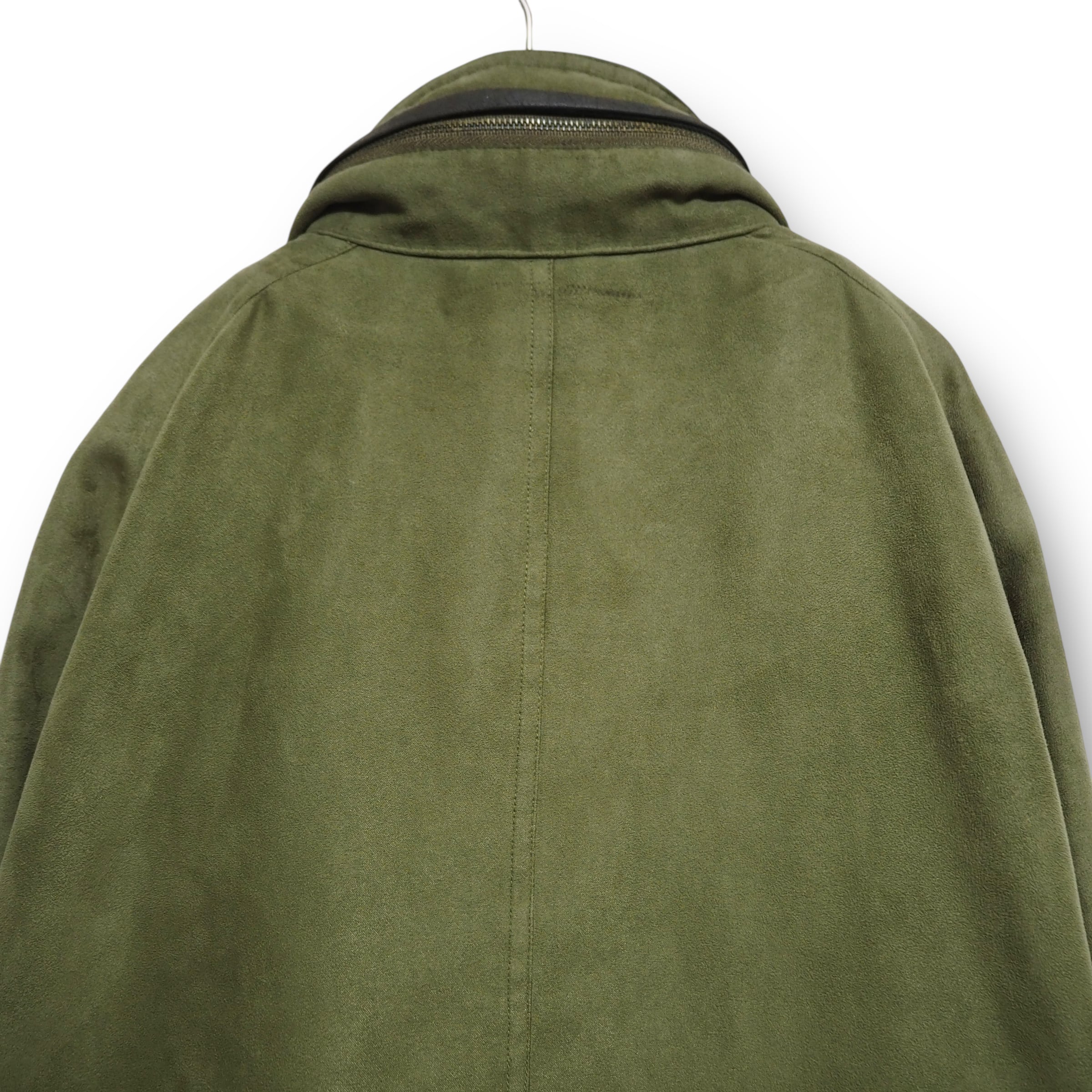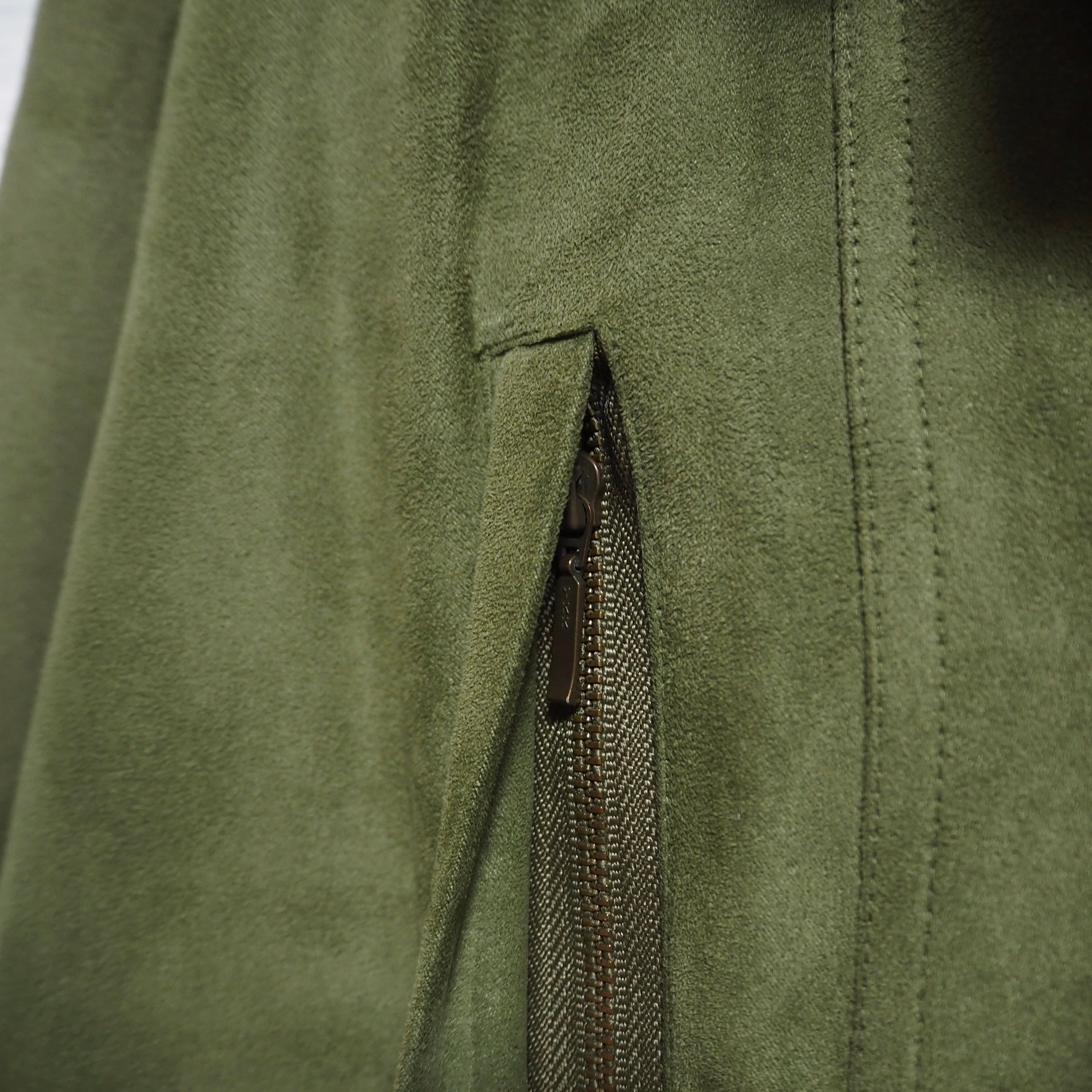 スエードライクな生地感をしています。裏地のライナー取り外し可能。折畳可能なフード付き。裏面上部に汚れあり。ジッパーの取っ手が使用感により、若干閉めにくいです。