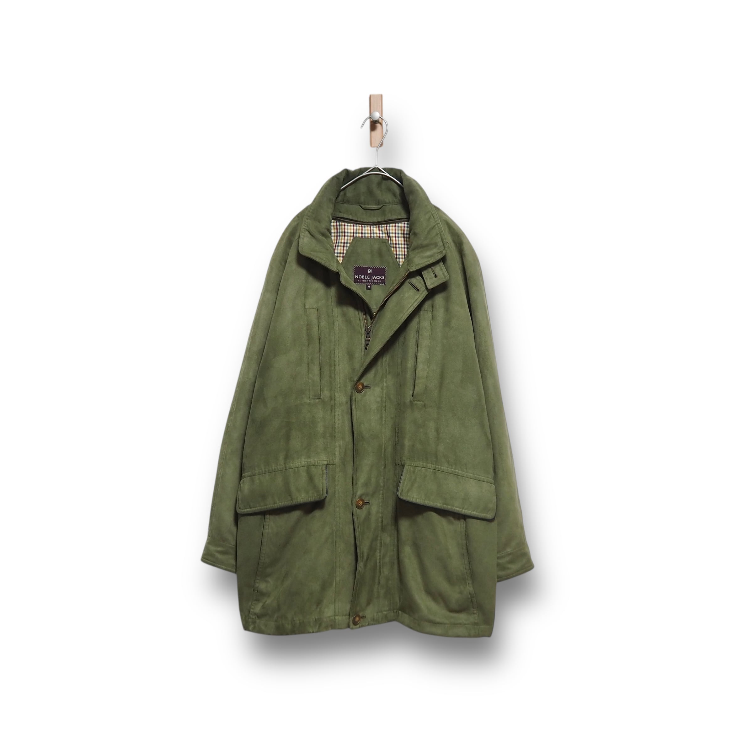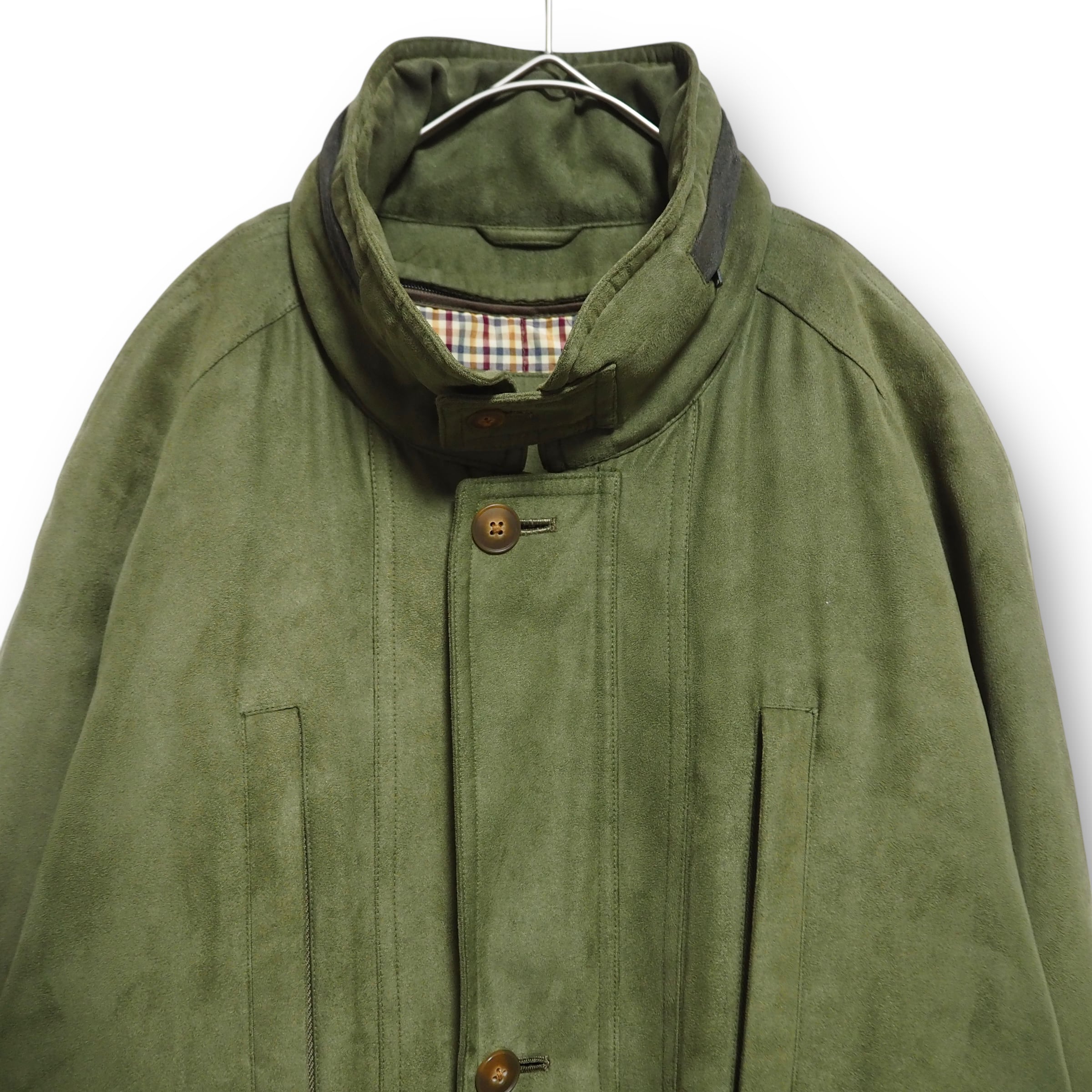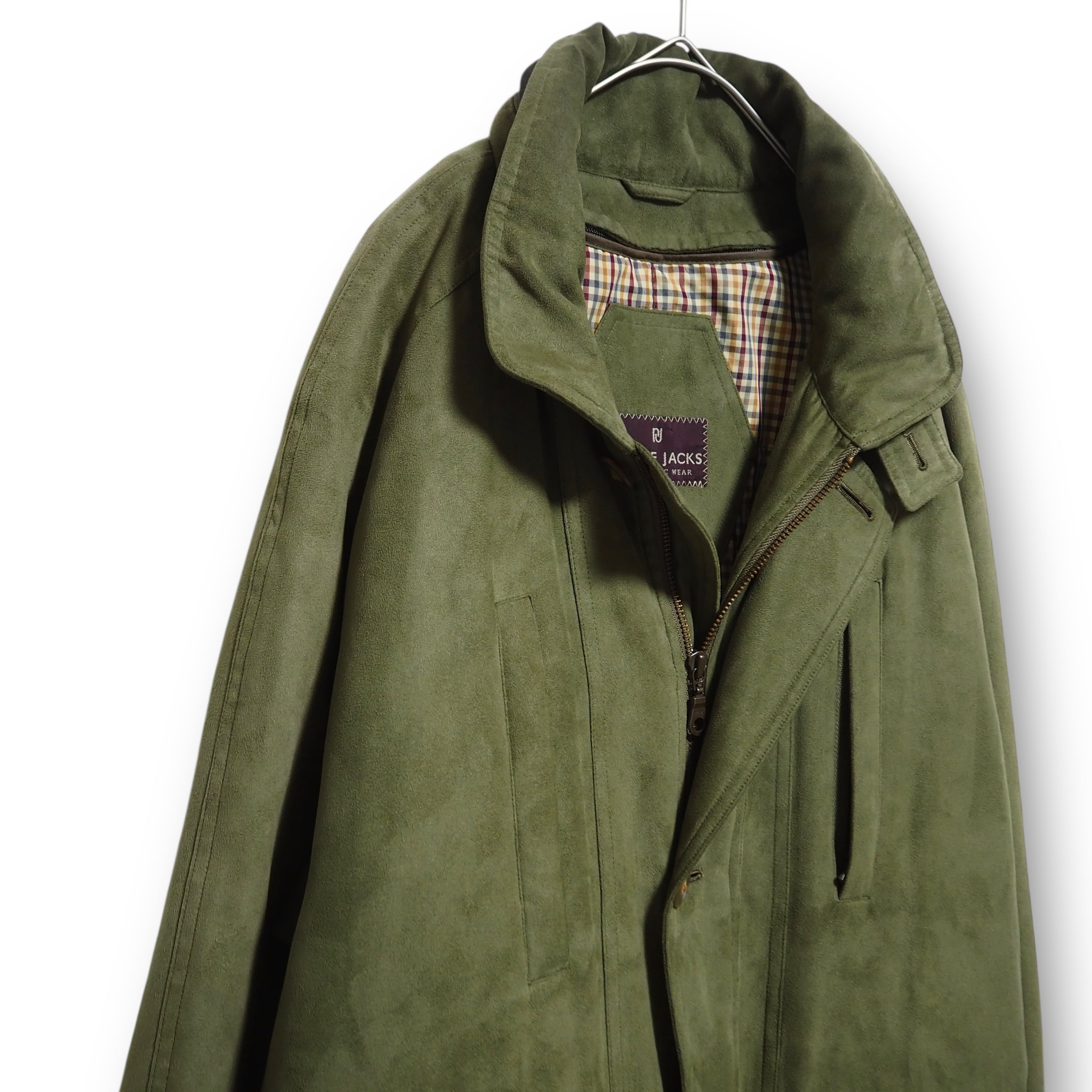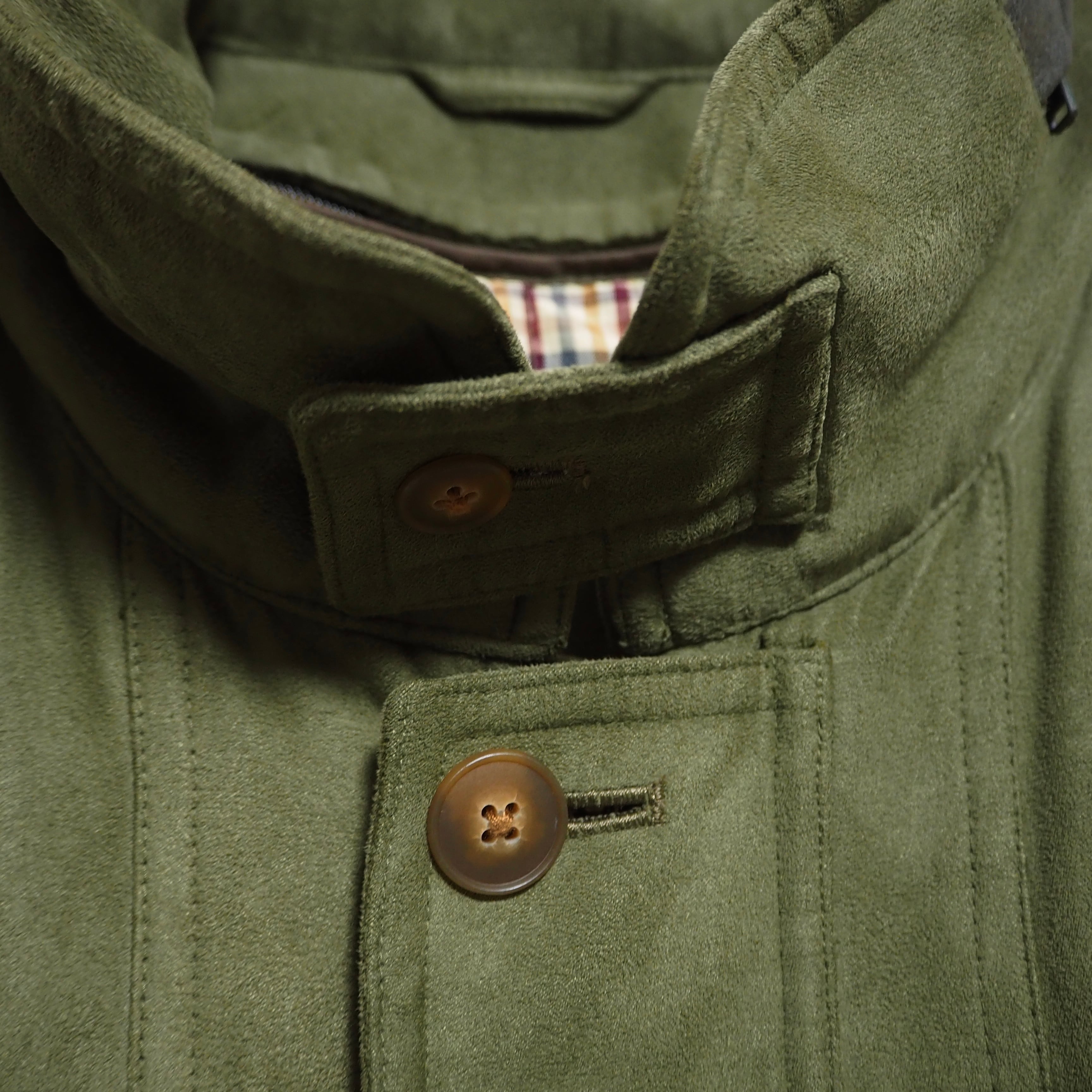 スエードライクな生地感をしています。裏地のライナー取り外し可能。折畳可能なフード付き。裏面上部に汚れあり。ジッパーの取っ手が使用感により、若干閉めにくいです。