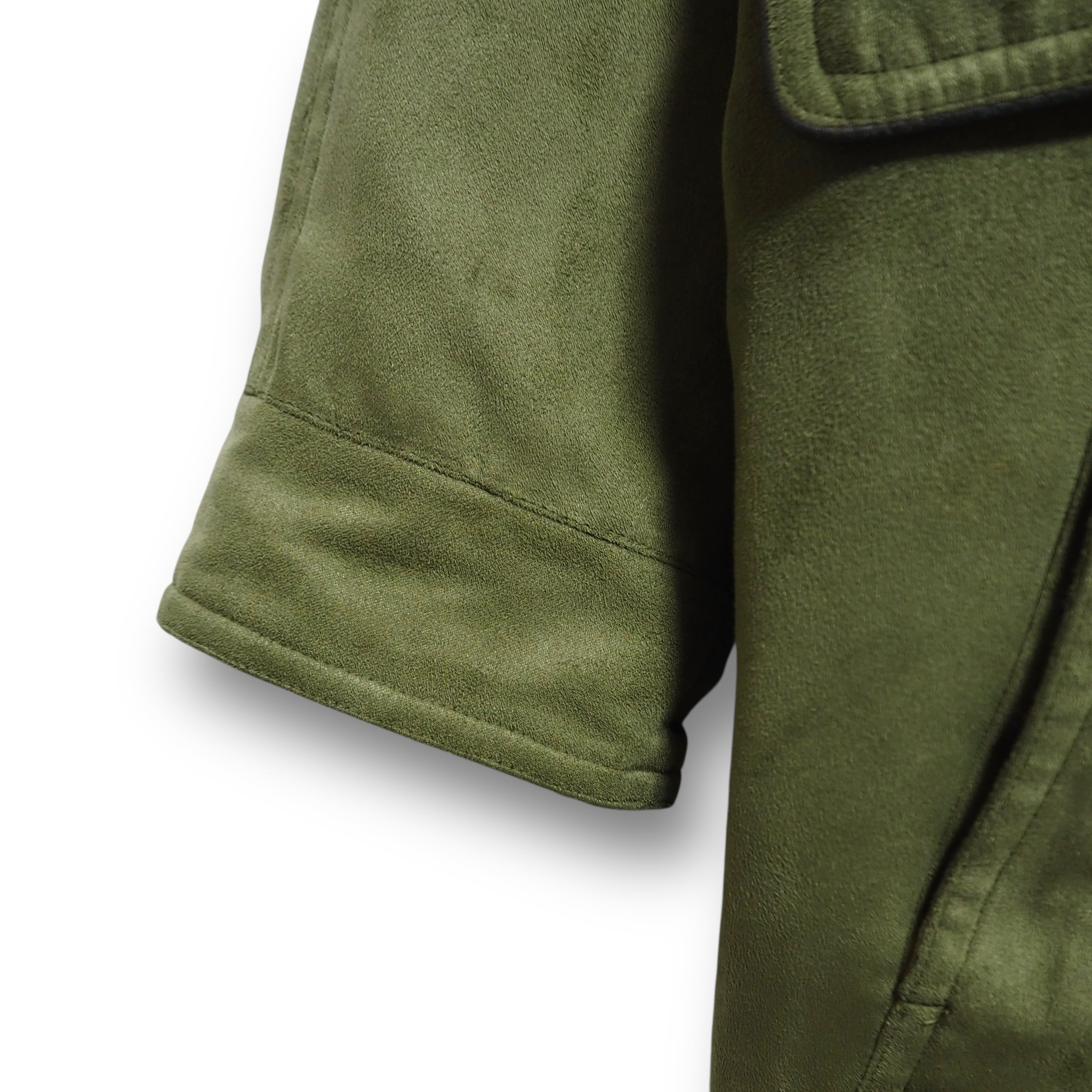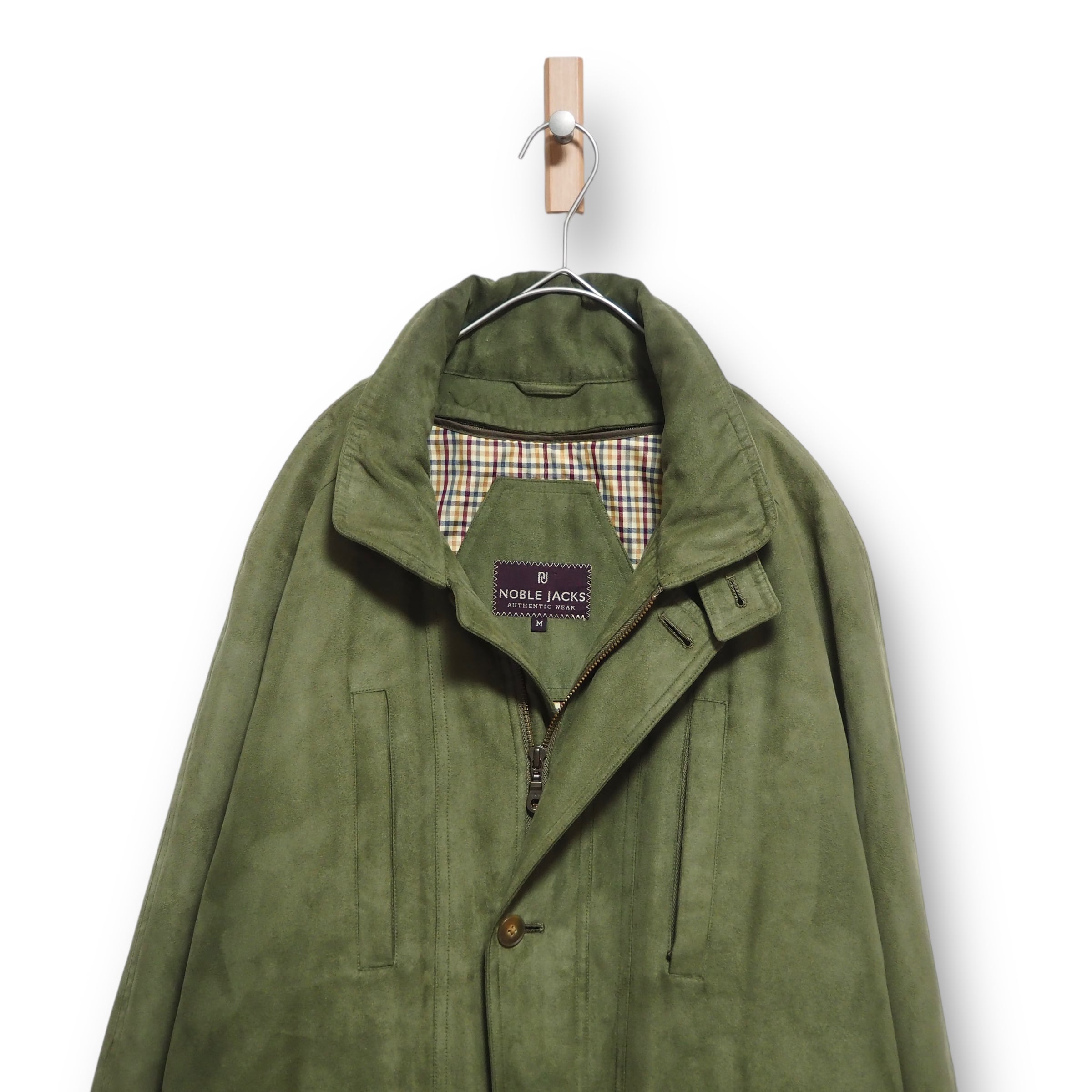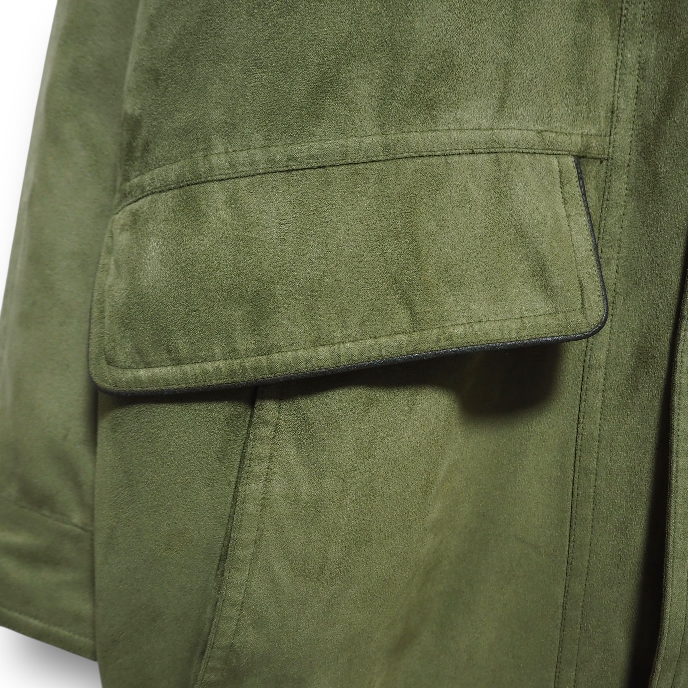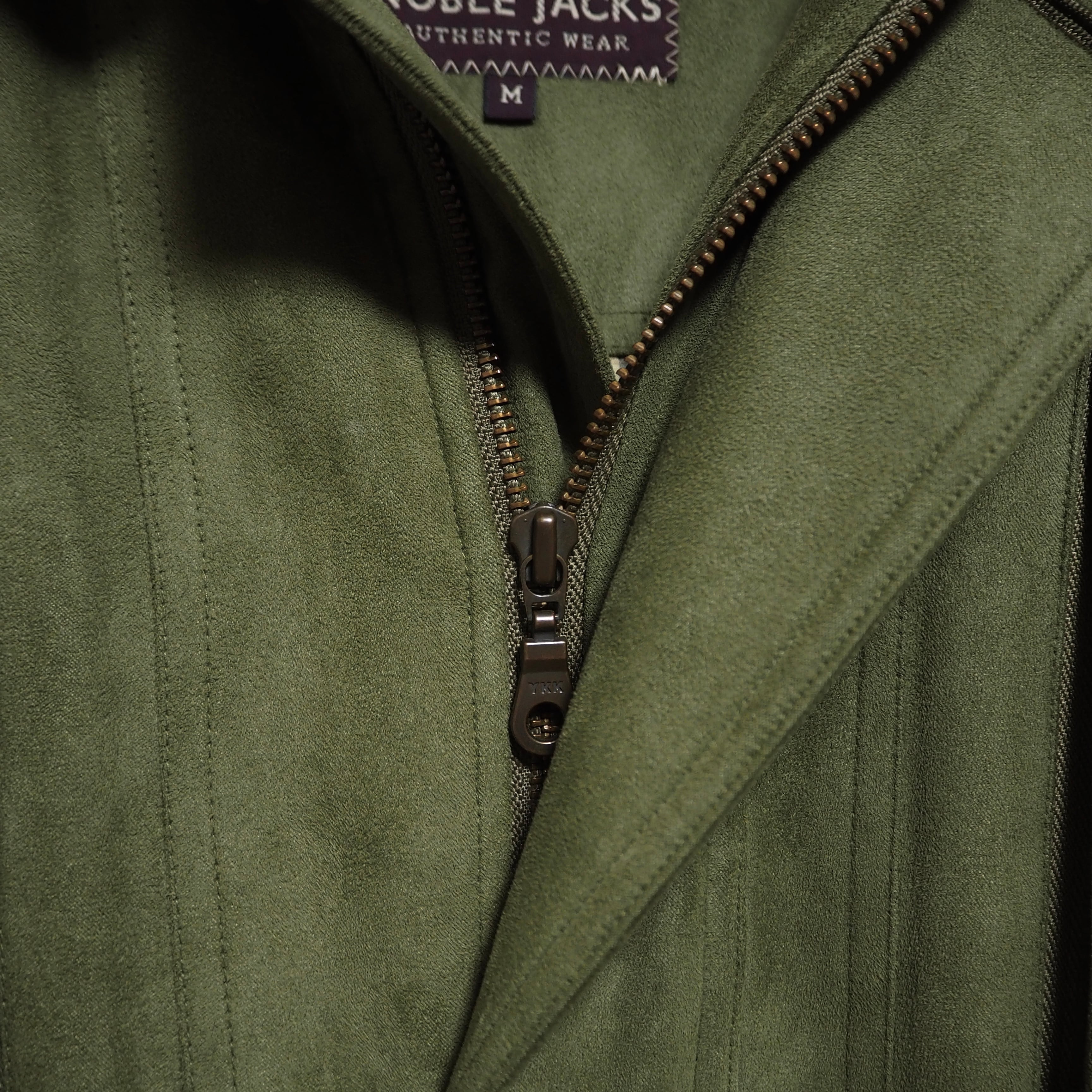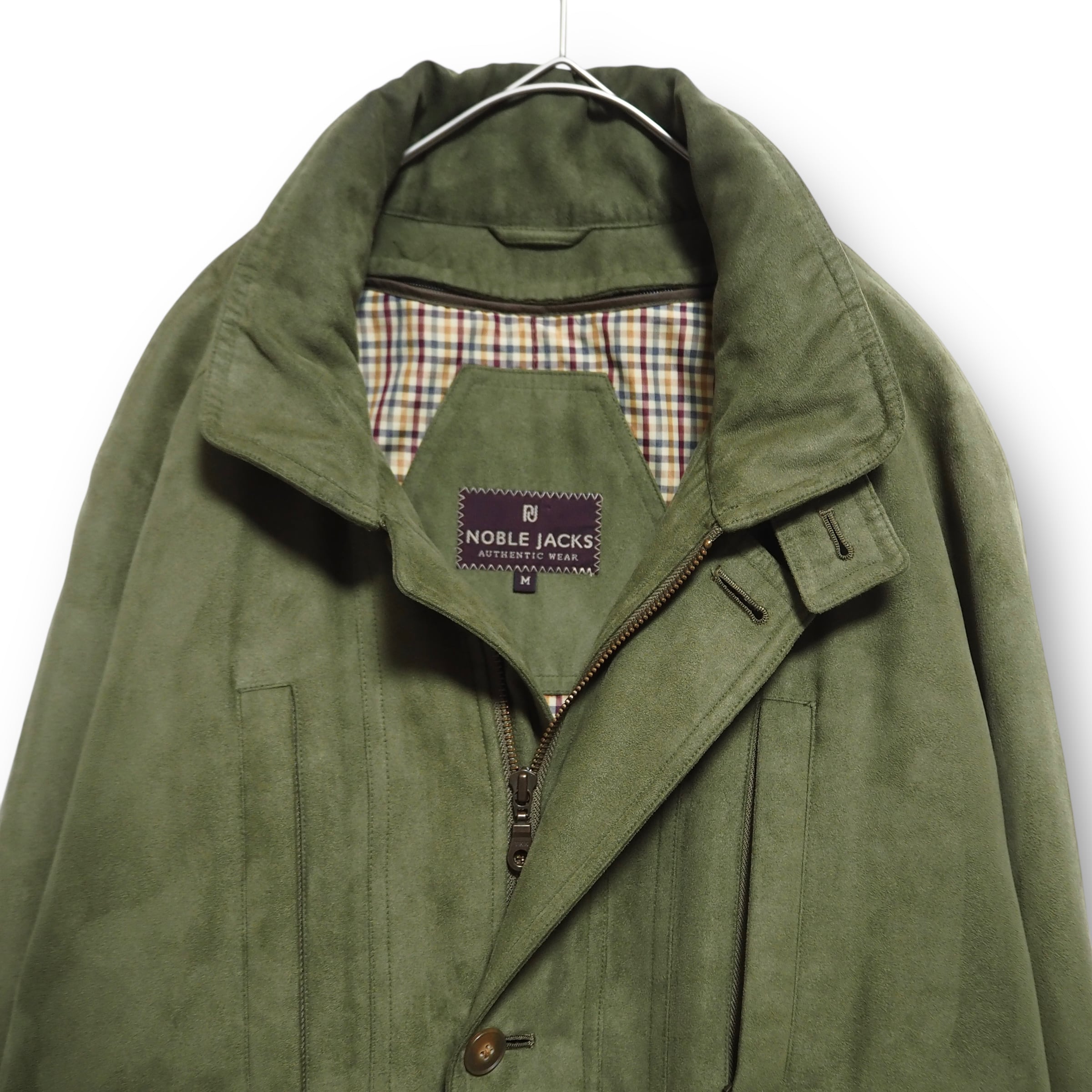 スエードライクな生地感をしています。裏地のライナー取り外し可能。折畳可能なフード付き。裏面上部に汚れあり。ジッパーの取っ手が使用感により、若干閉めにくいです。