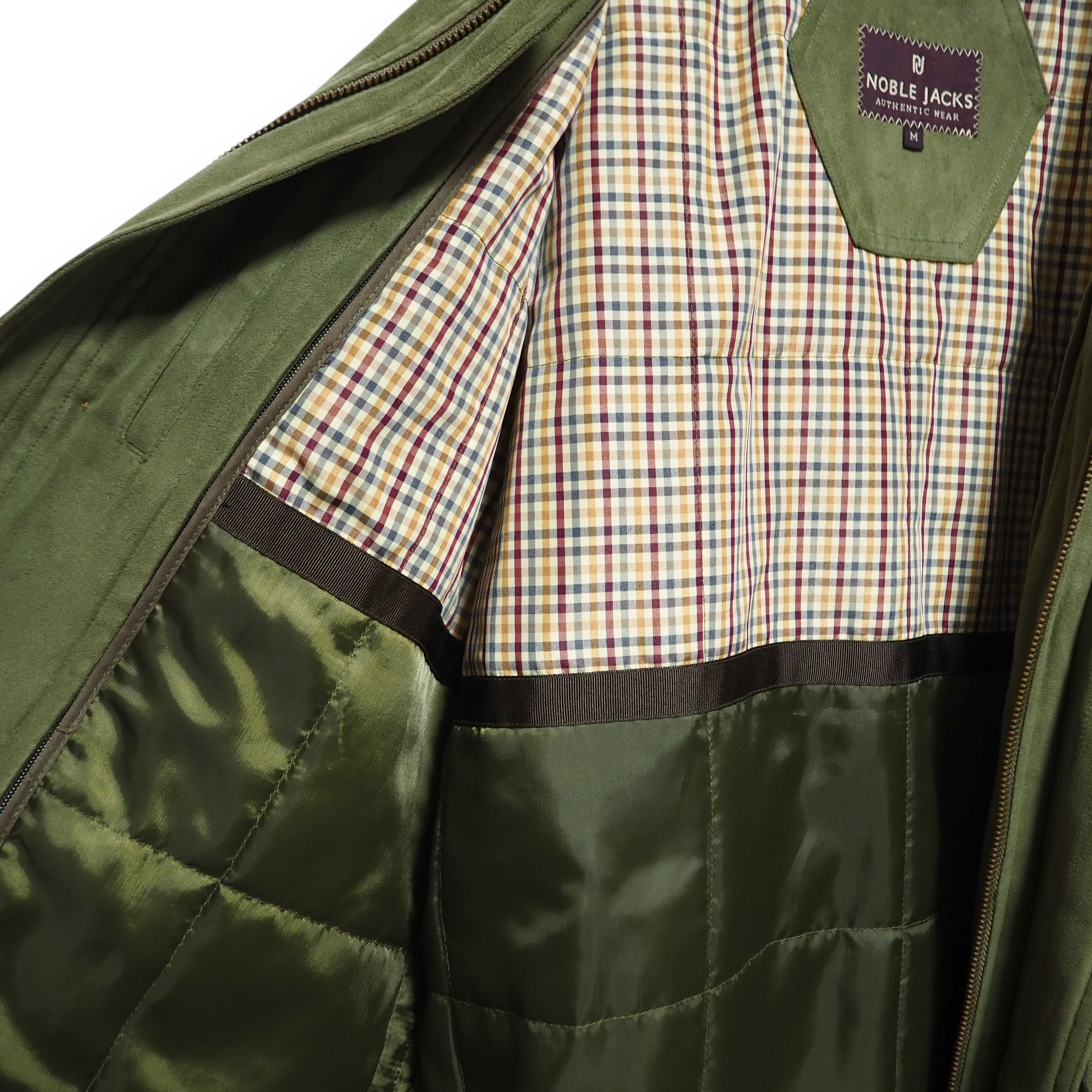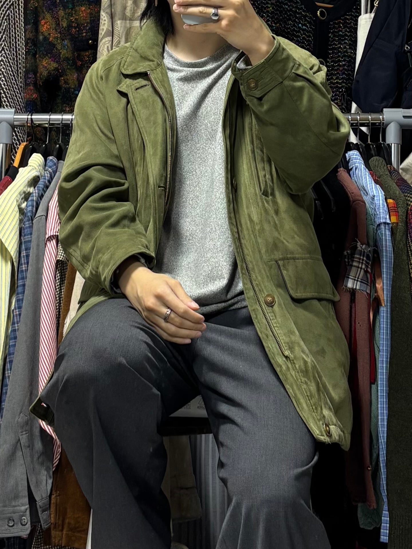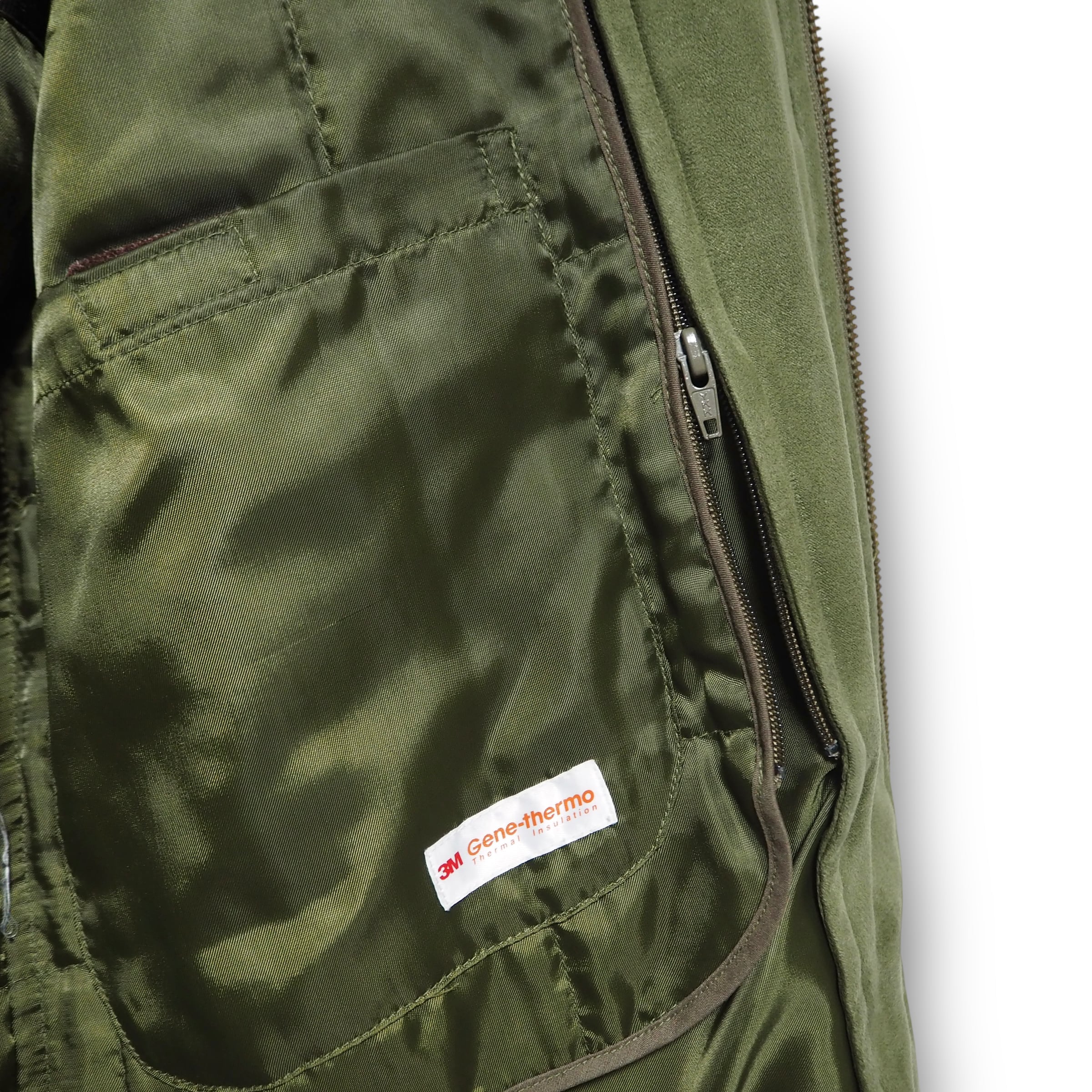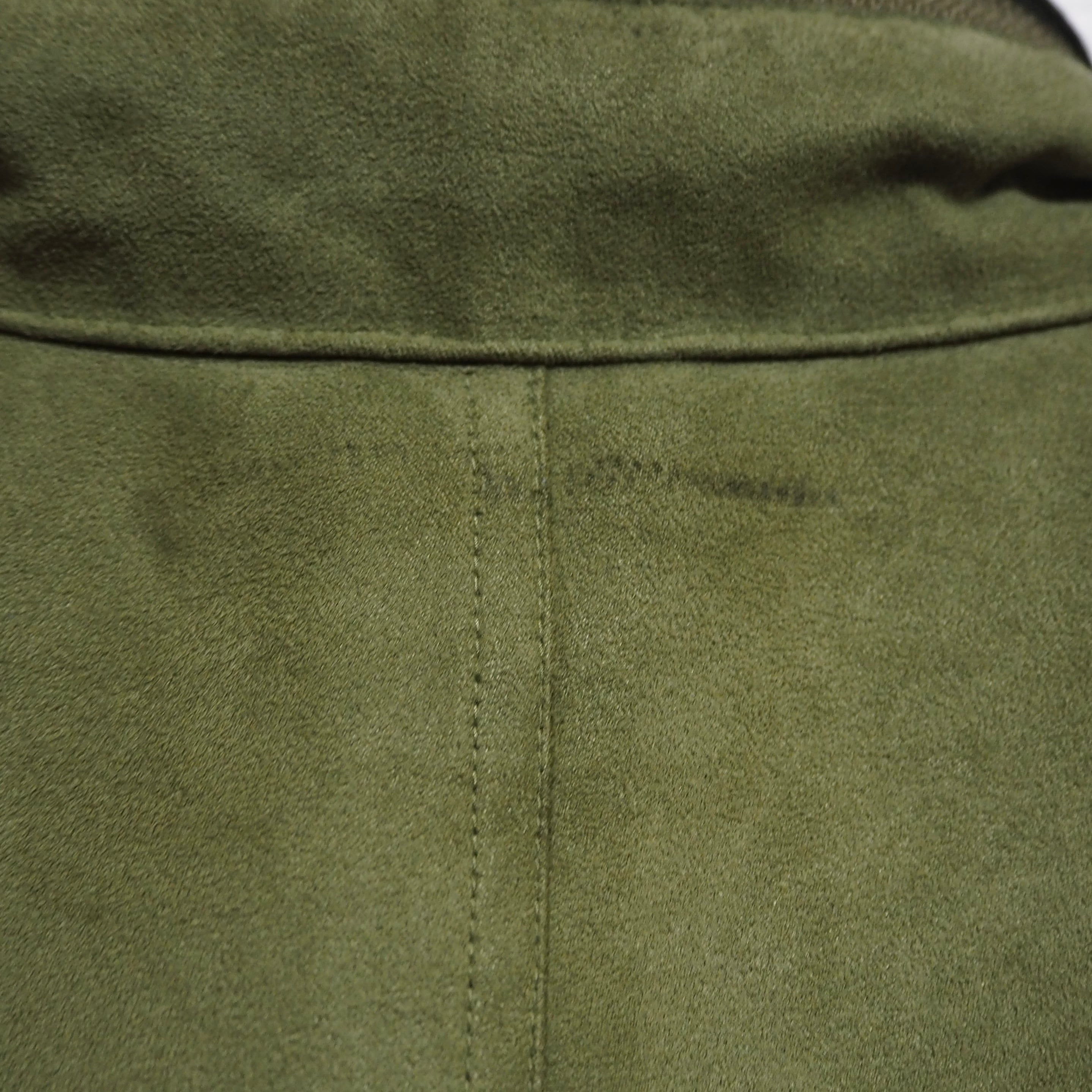 スエードライクな生地感をしています。裏地のライナー取り外し可能。折畳可能なフード付き。裏面上部に汚れあり。ジッパーの取っ手が使用感により、若干閉めにくいです。