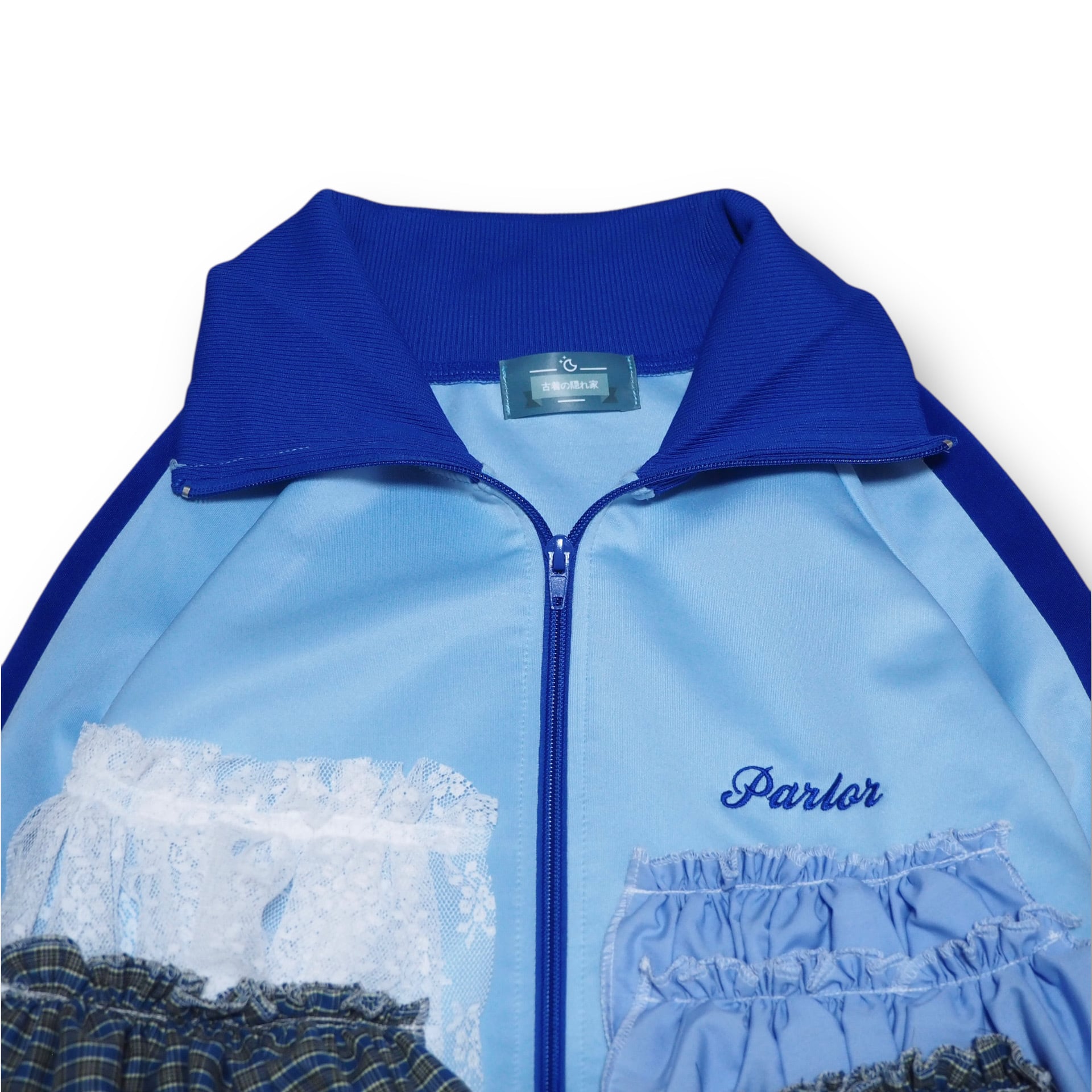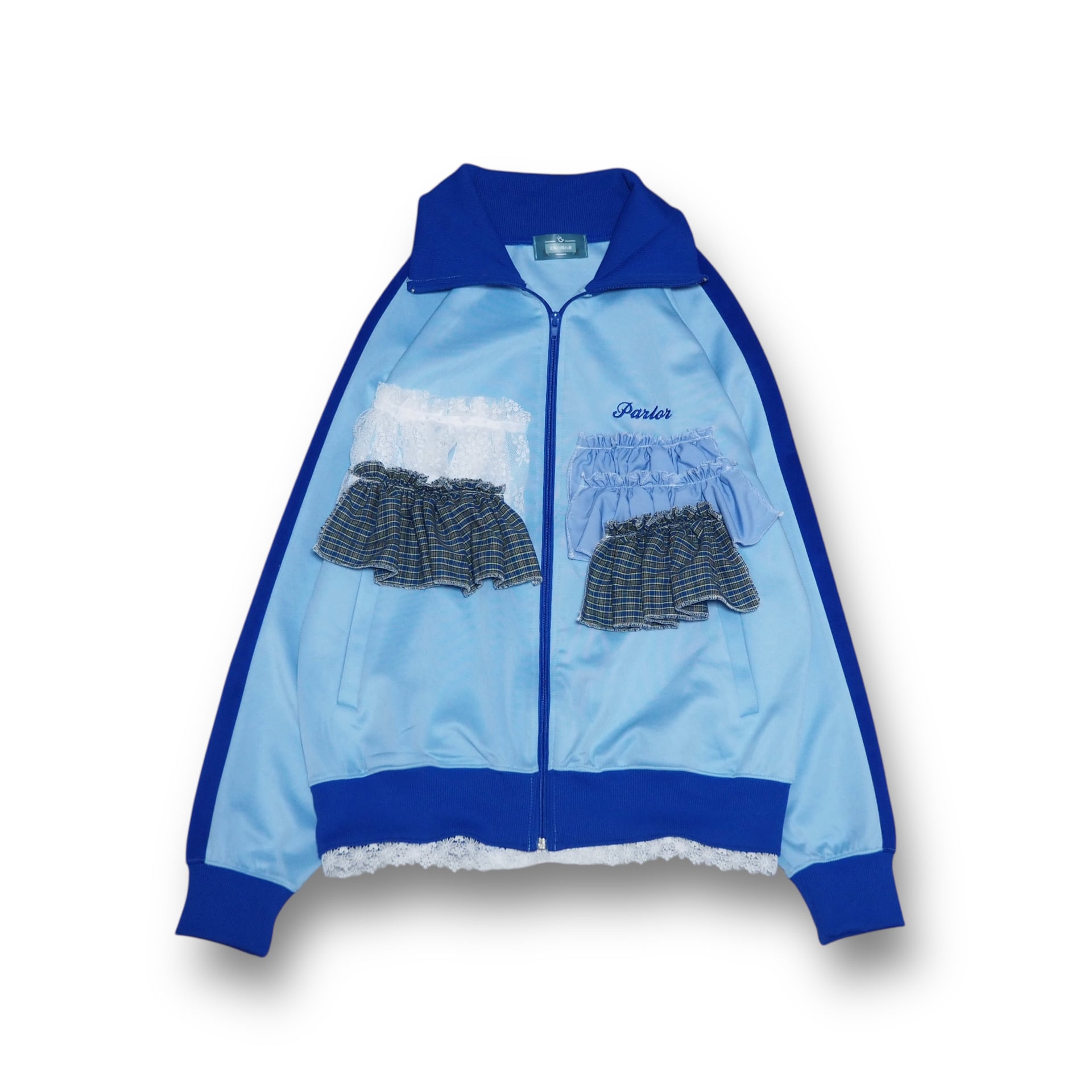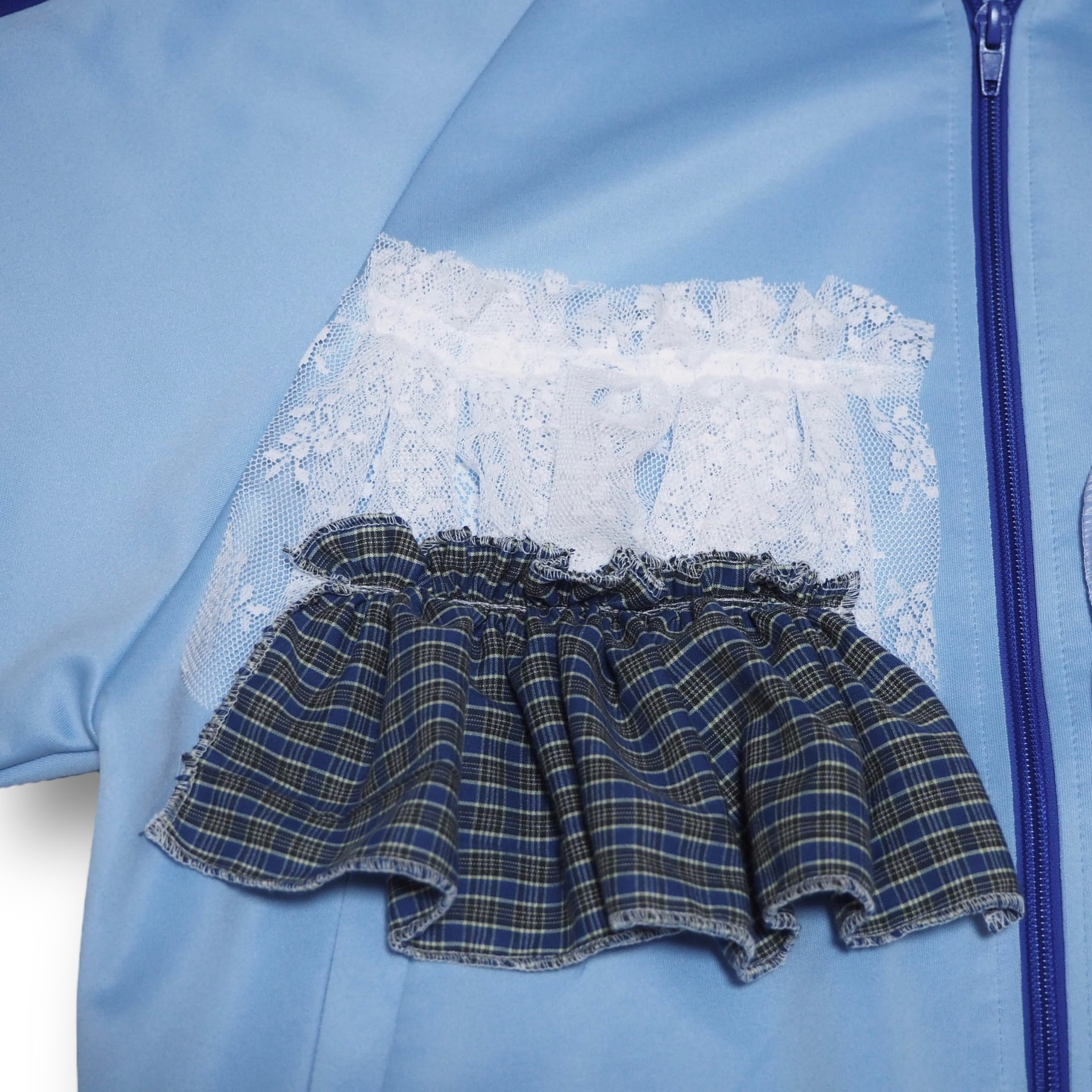 スポーティーなトラックジャケットにフリルとレースを取り付けたリメイクアイテムです。