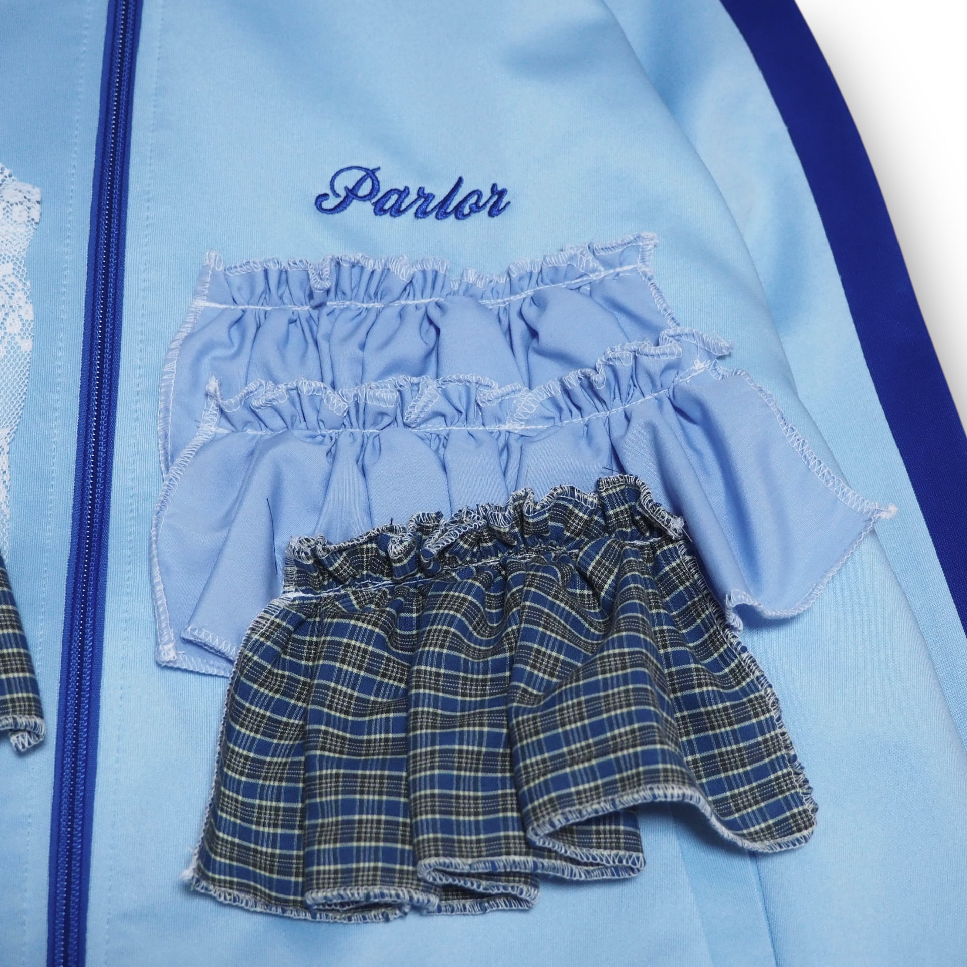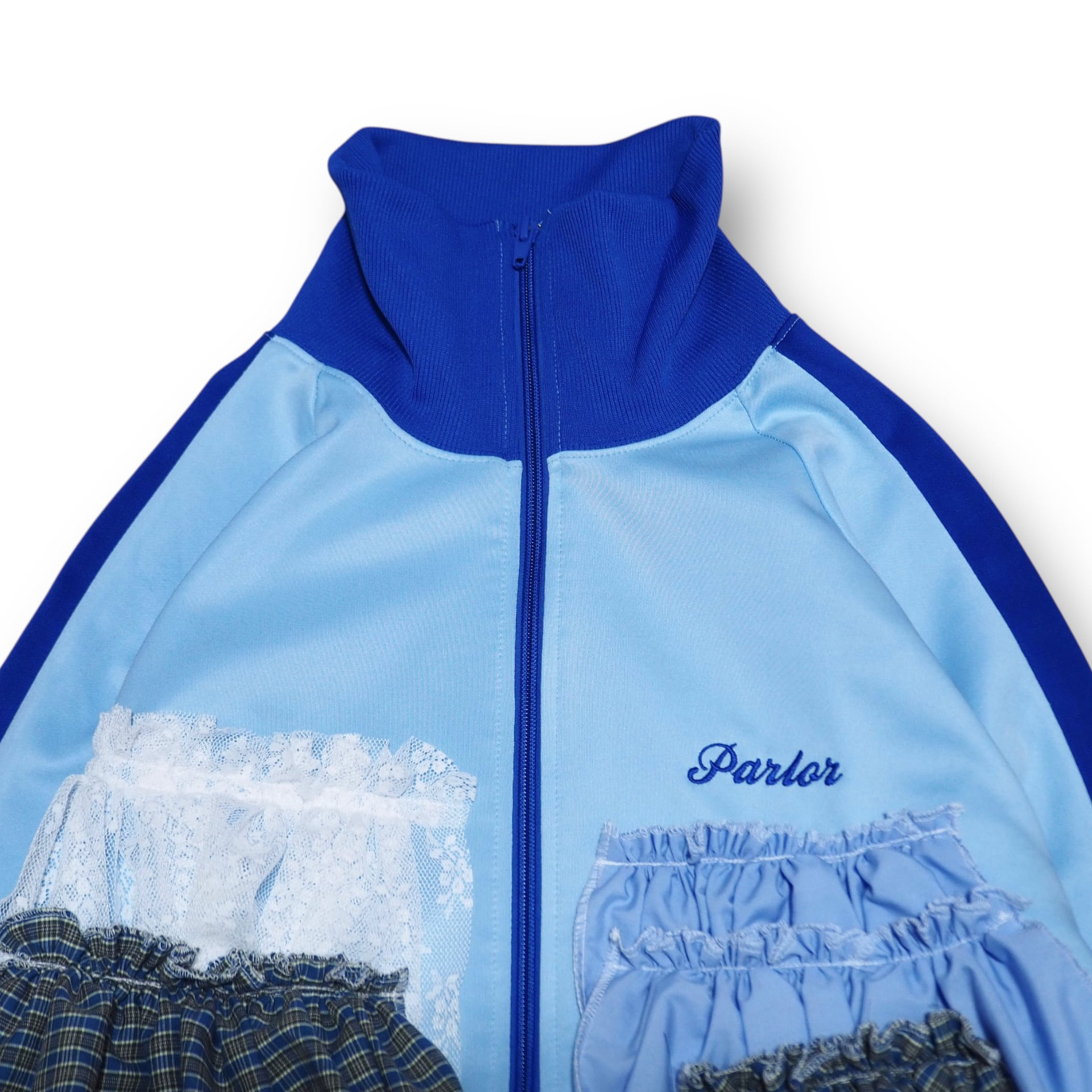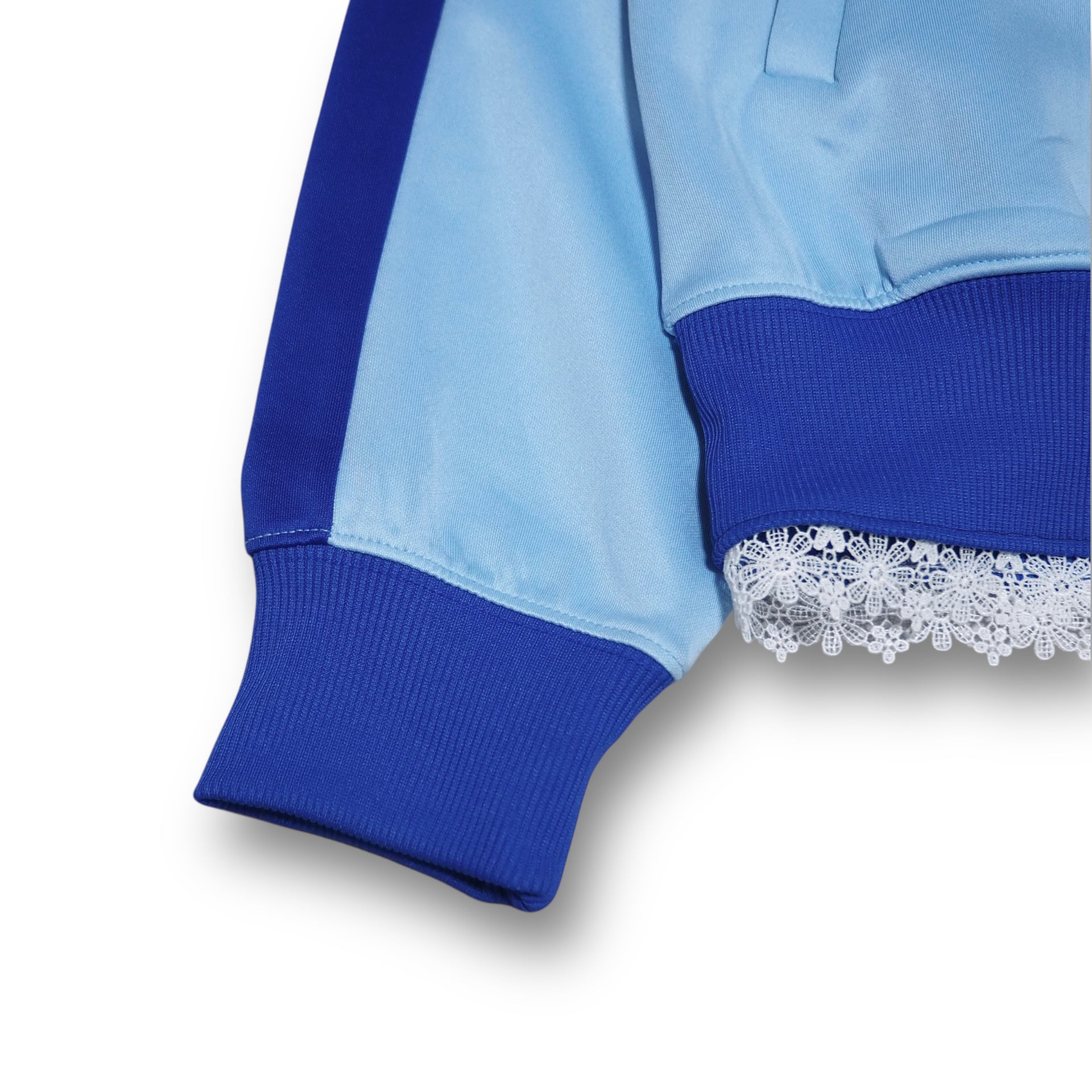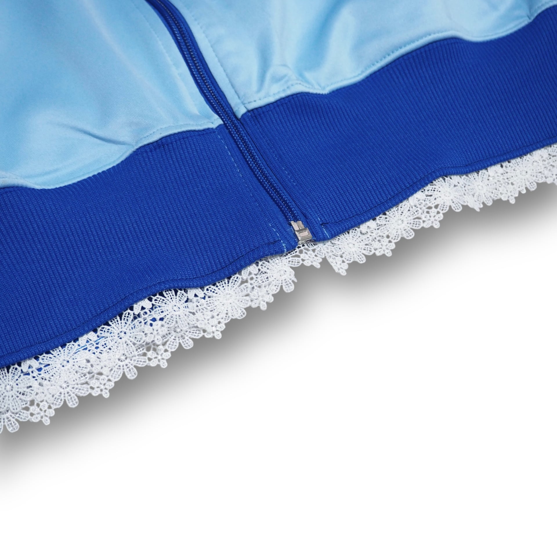 スポーティーなトラックジャケットにフリルとレースを取り付けたリメイクアイテムです。