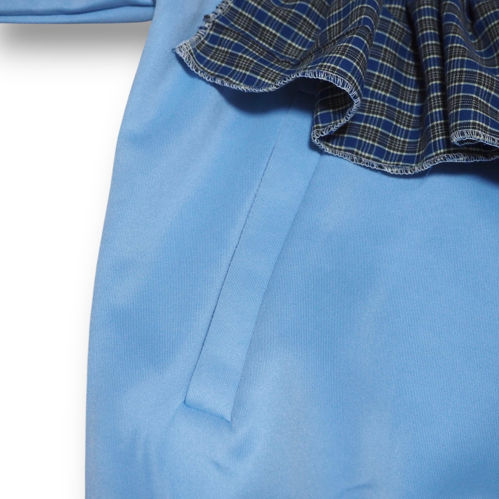 ベースの色味に合うよう寒色系統の生地を組み込み、キュートに仕立てました。裾リブがしっかりと効いたシルエットで着用できるため、ジャストめサイズでご着用頂けそうです。デニムなどはもちろんフリルやレース生地のパンツ、スカートとも合わせやすく様々な場面で活躍してくれます。