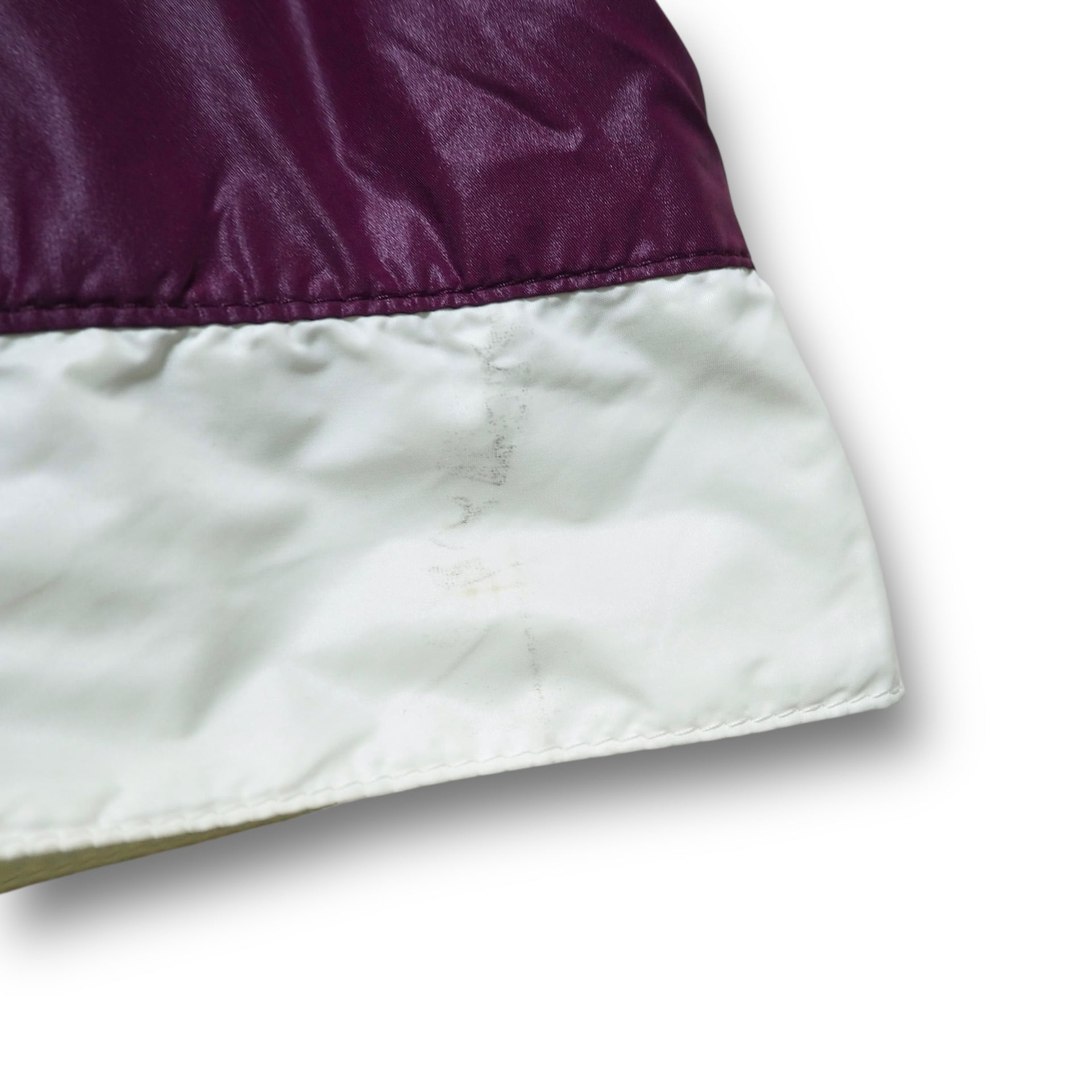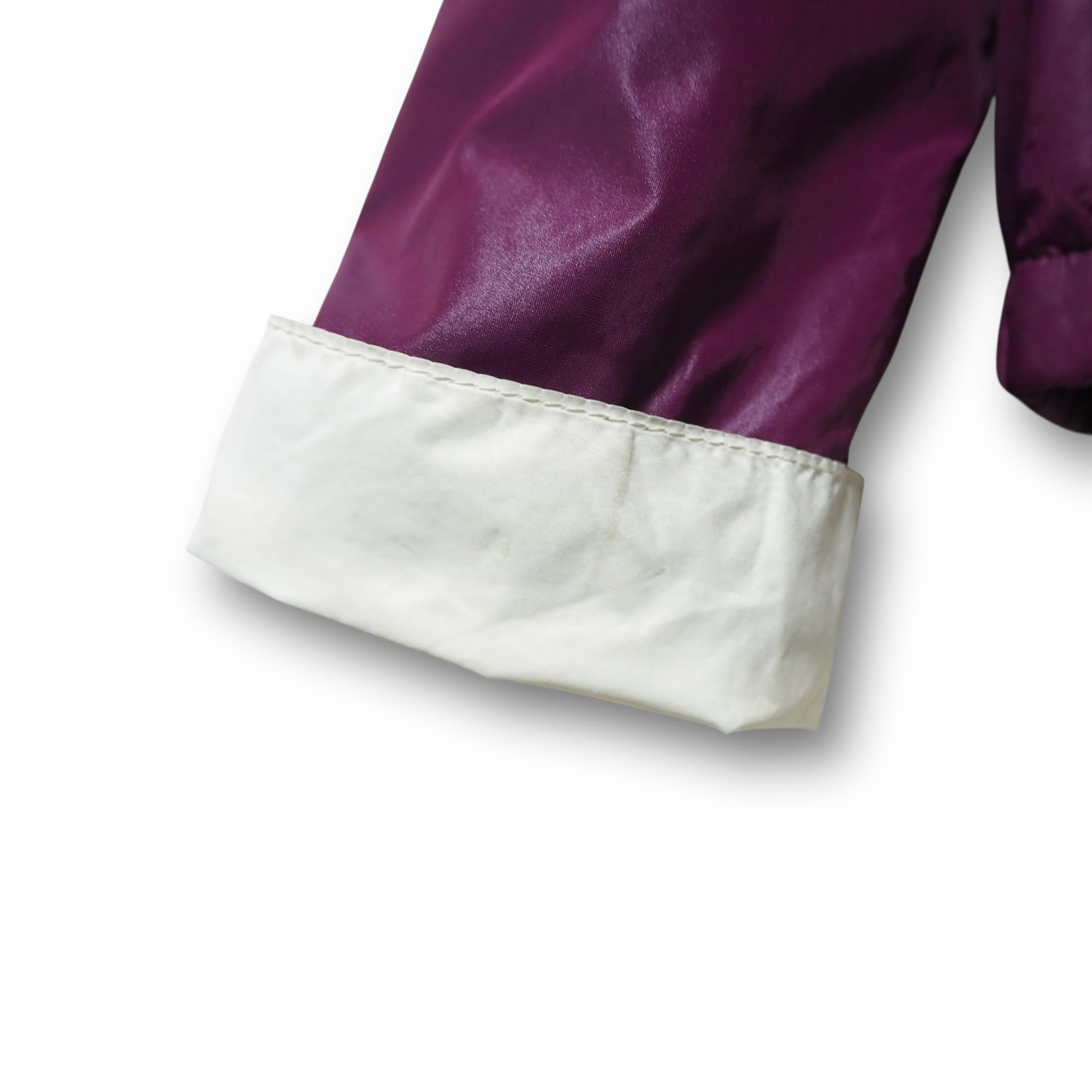 両袖口(内側も)、内襟、表面左肩にやや汚れあり。裏地裏起毛。折りたたみ可能なフード付き。