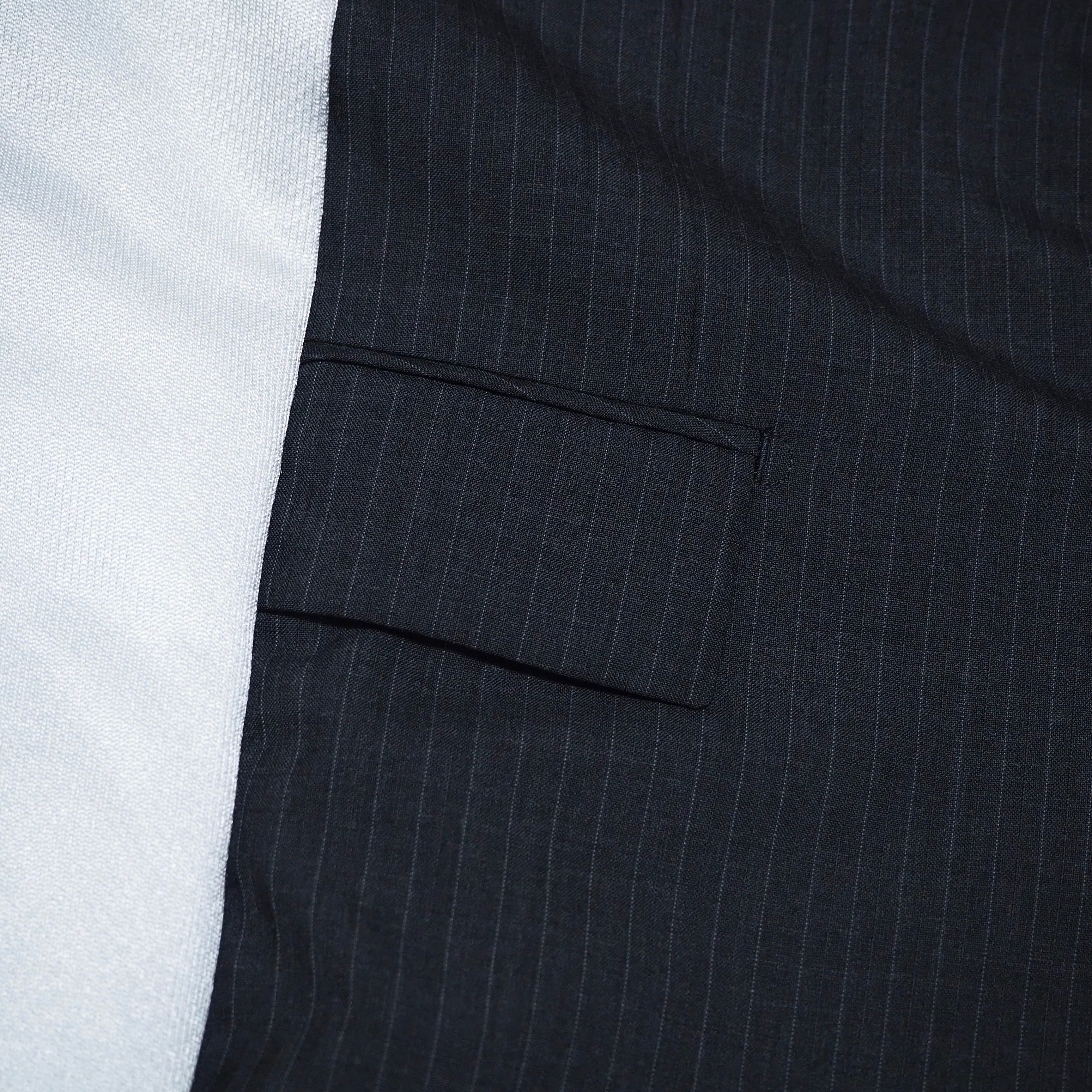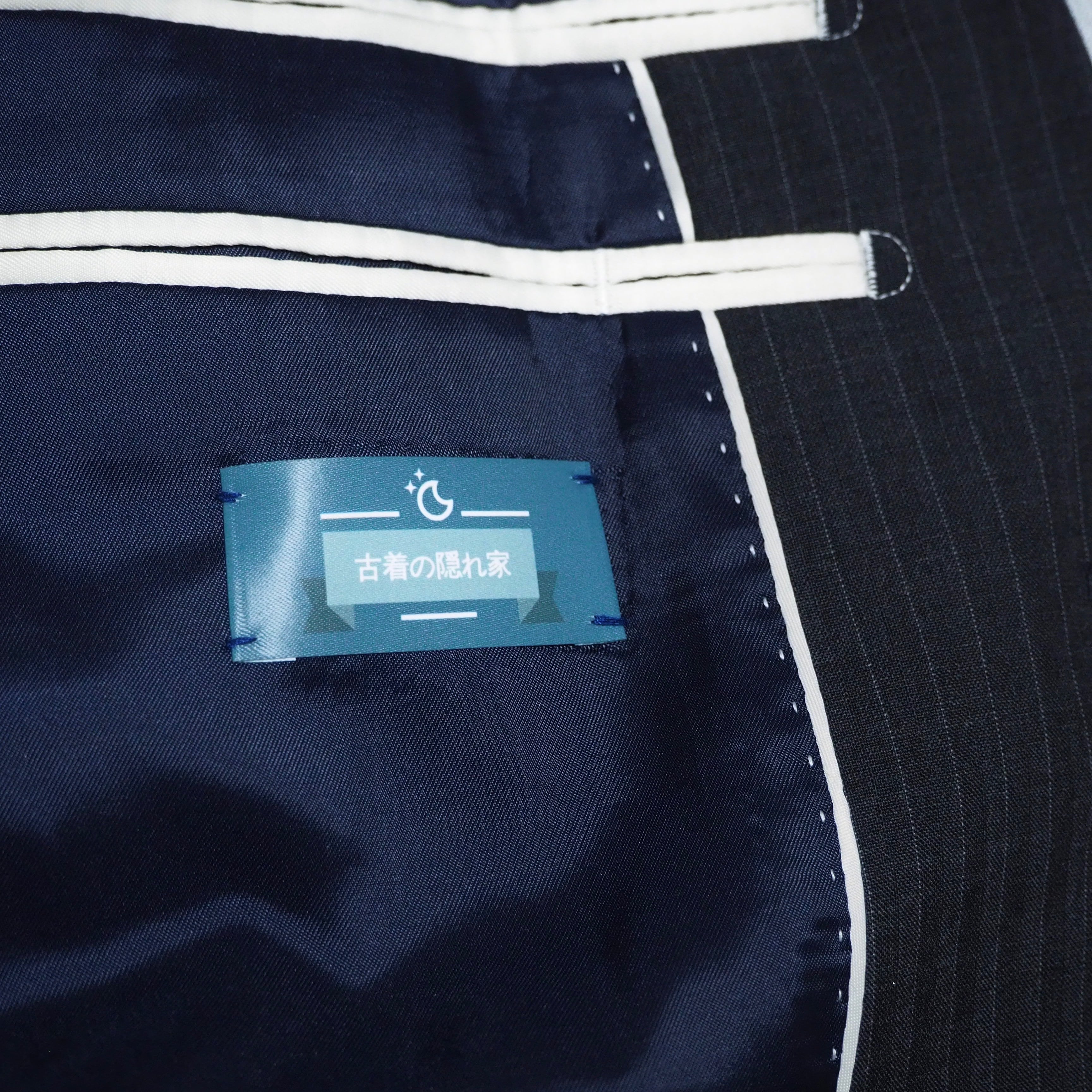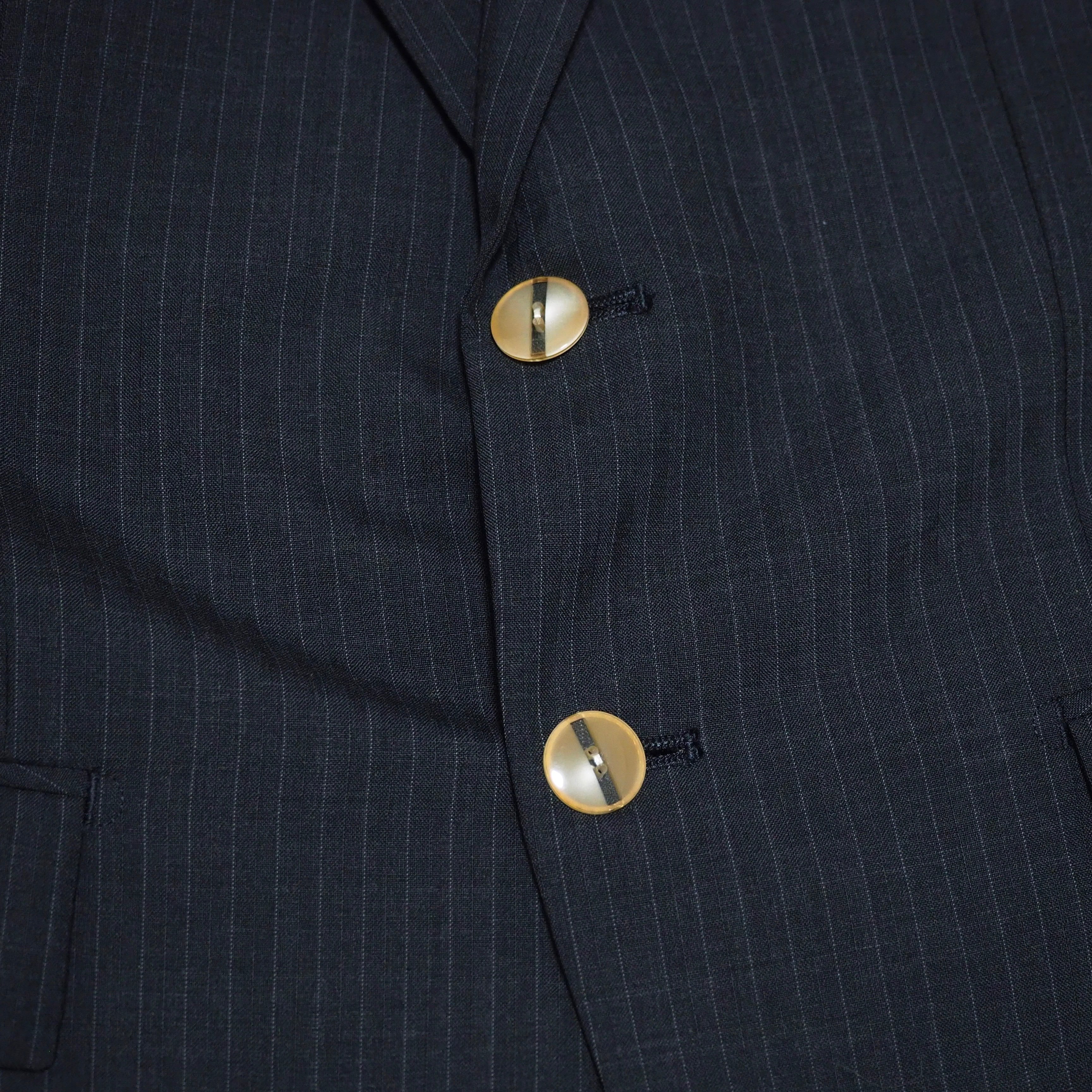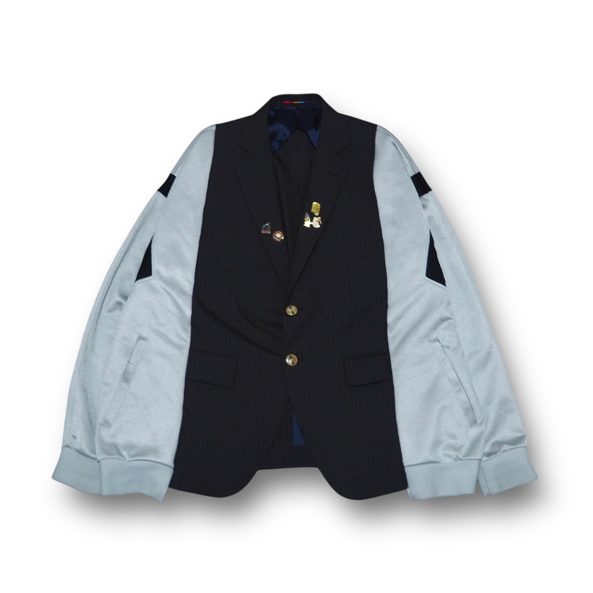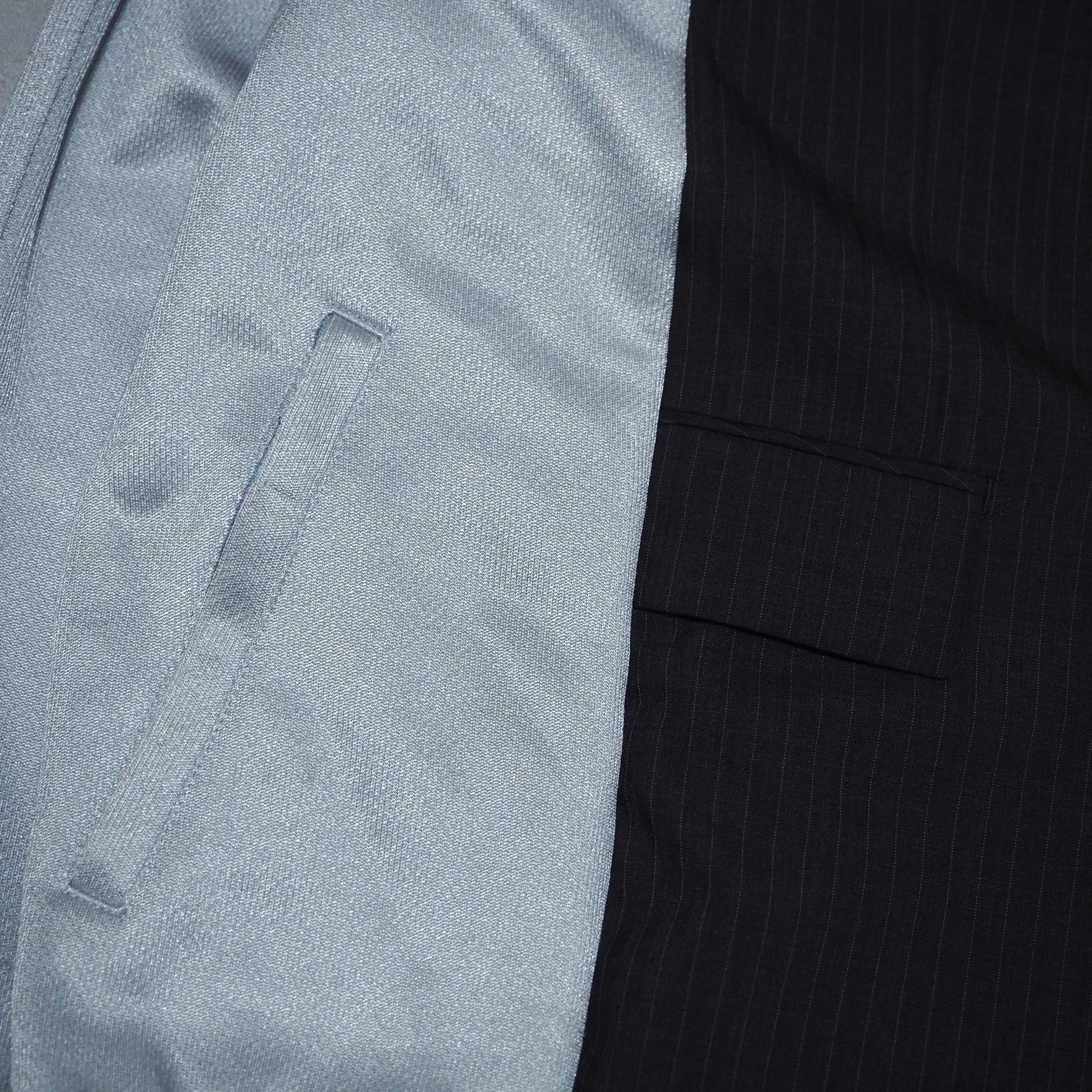無彩色よりのカラーを基調とさせ、トラック部分のブルーやピンバッチなどの装飾がアクセントとなるように再構築致しました。リメイクならではの程よくゆるめなサイジングが魅力的で、クラシカルの中にあえて力の抜けたムードを忍ばせております。フォーマルとスポーティ、その境界を曖昧にするユニークな仕上がりです。
