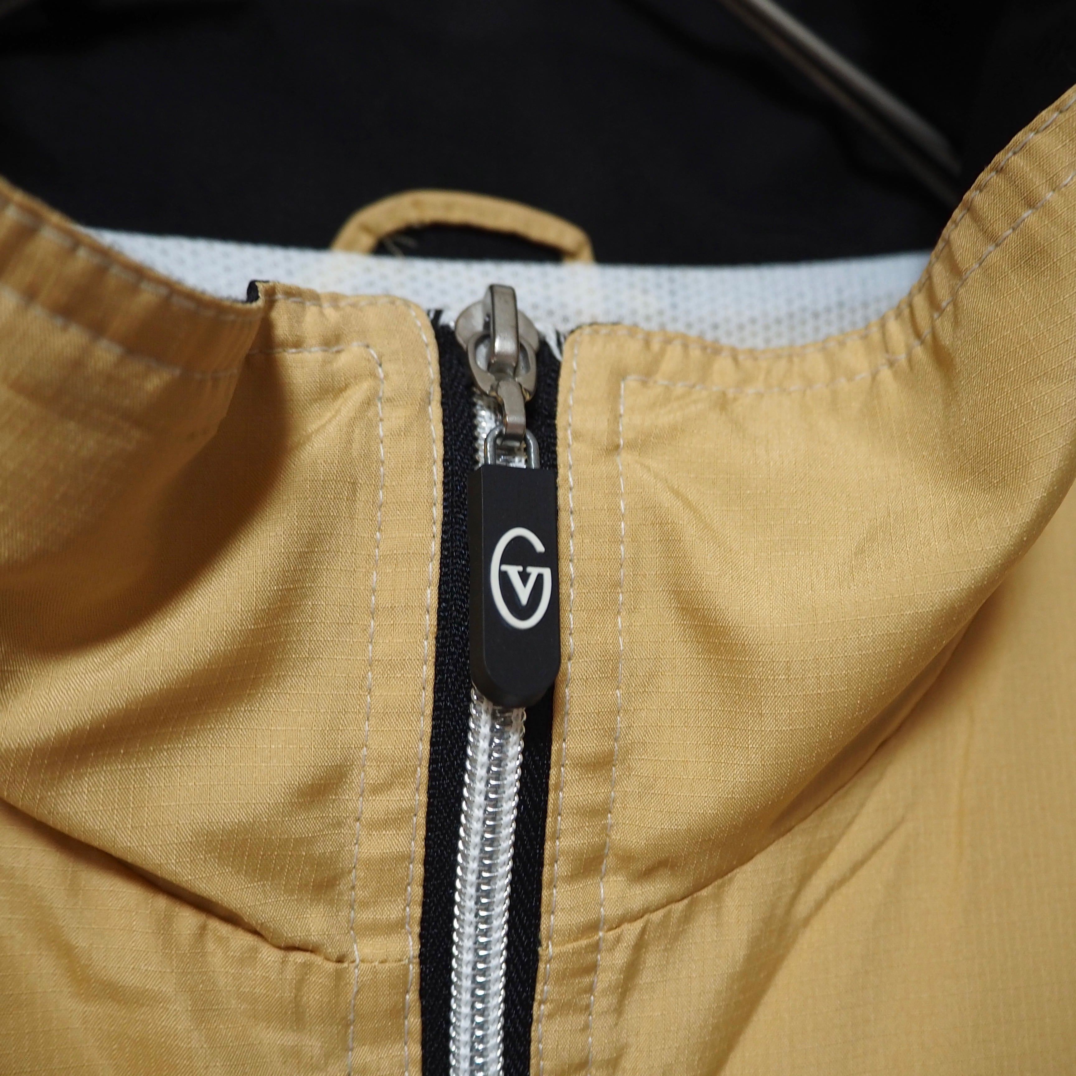 表面胸元に目立たないシミあり。表面左袖、裏面右袖や下部にシミ、汚れあり。裏地メッシュ加工。
